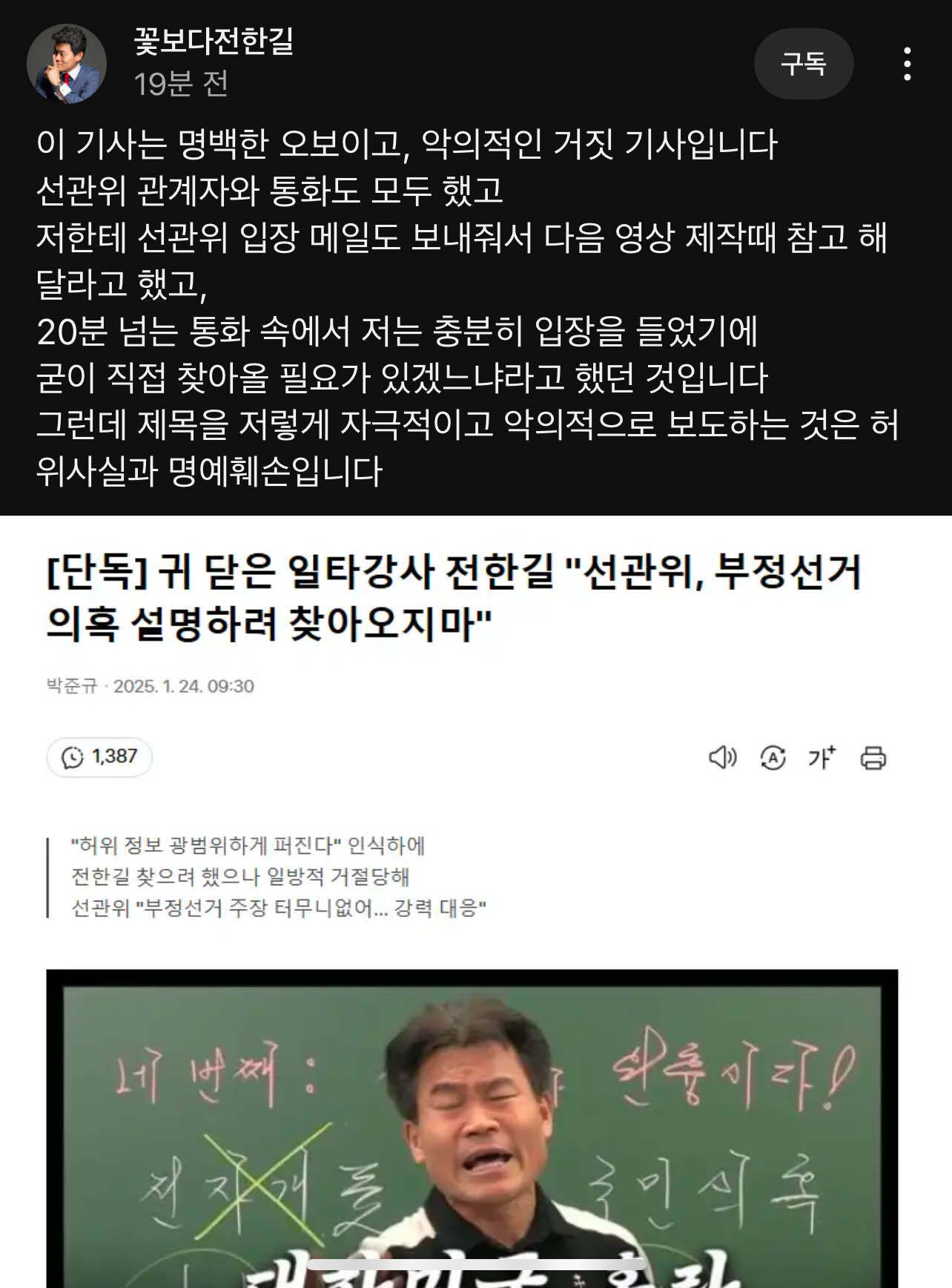 [단독] 귀 닫은 일타강사 전한길 "선관위, 부정선거 의혹 설명하려 찾아오지마" https://www.hankookilbo.com/News/Read/A2025012320160002691 뭐 이미 판단 다 끝난거나 마찬가지인 사람입니다만 한국일보가 확인 사살하는 기사를 올리길래 그냥 업어와봤읍니다. 0