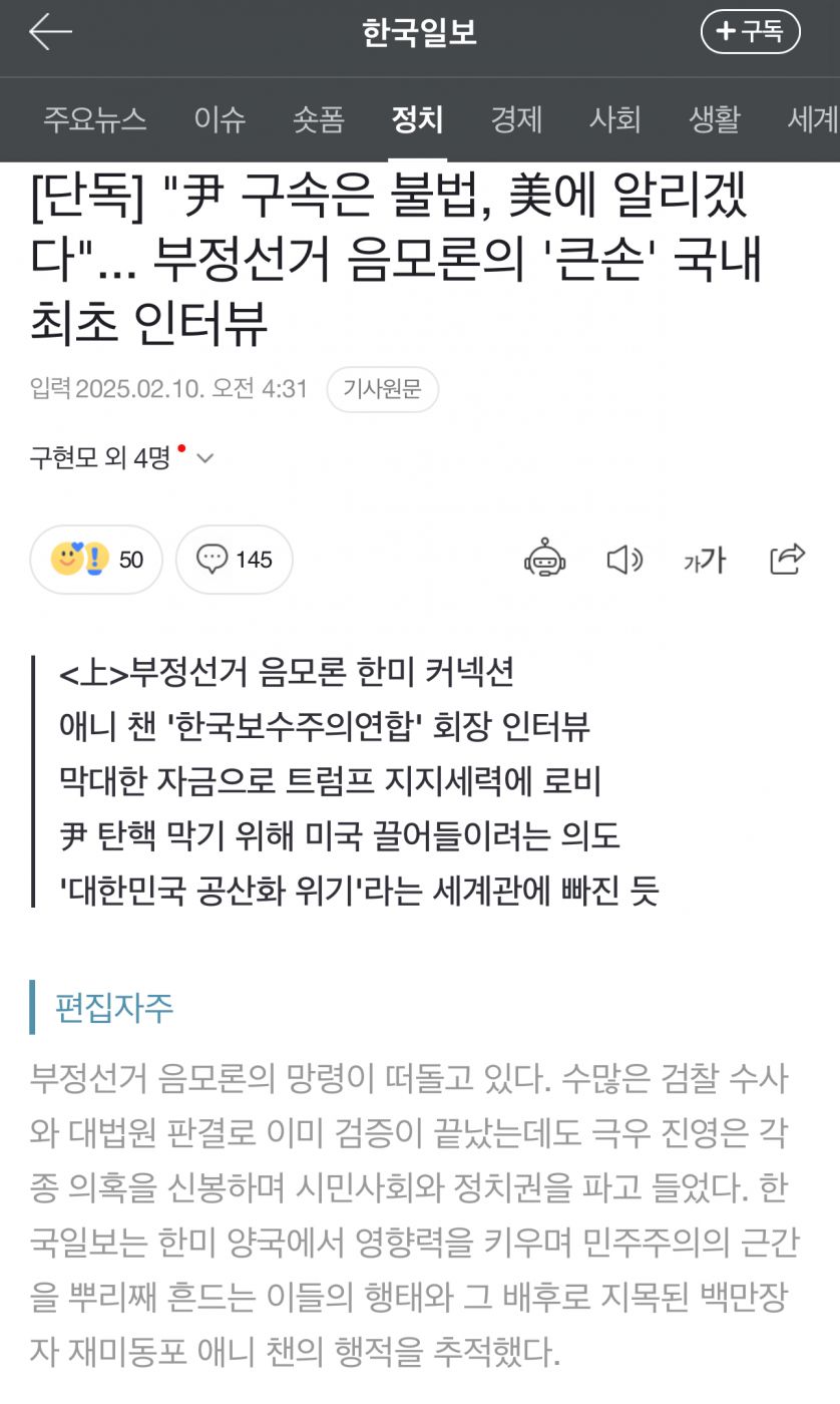 Subject   "尹 구속은 불법, 美에 알리겠다"... 부정선거 음모론의 '큰손' 국내 최초 인터뷰