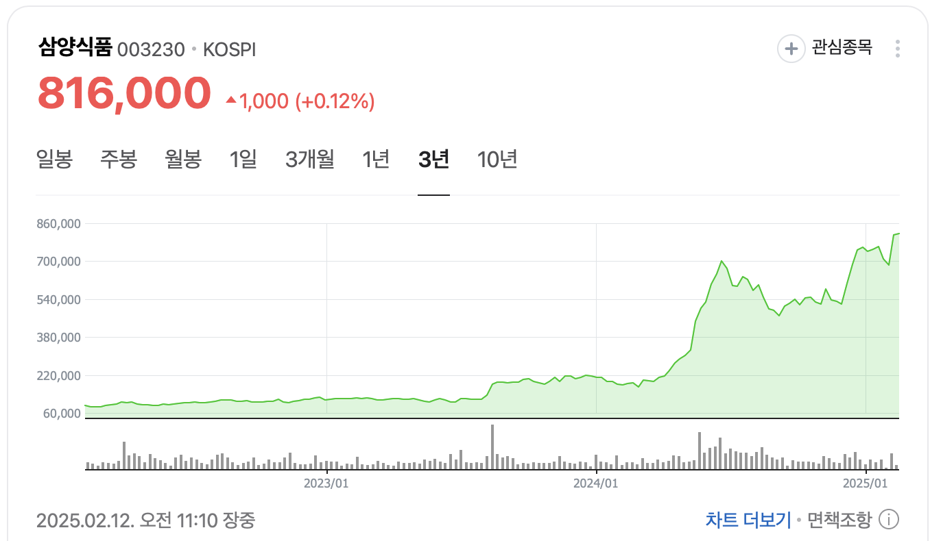 11일 유통업계에 따르면 현재 CU·GS25·세븐일레븐에서 불닭볶음면의 발주가 이뤄지지 않고 있다. 편의점업계 관계자는 "며칠 전부터 공급 부족으로 인해 발주가 중단된 상태"라며 "정상적인 발주 재개 시점은 아직 정해지지 않았다"고 밝혔다. 삼양식품 관계자는 "불닭볶음면의 생산량이 제한되어 있어 내수와 수출 주문량을 동시에 맞추기 어려운 상황"이라며 "지난달 설 연휴 기간 동안 공장 가동을 중단한 영향으로 국내 시장 공급이 일시적으로 부족했지만 조만간 안정될 예정"이라고 설명했다. ------- 한편 삼양식품은 지난해 사상 최대 실적을 기록했다. 이 회사의 지난해 연결기준 매출과 영업이익은 1조7300억원, 3442억원으로 전년 동기 대비 각각 45%, 133% 증가했다. 수출 비중은 2023년 68%에서 지난해 3분기 기준 77%로 1년 만에 10% 가량 늘었다. 미국과 유럽 내 불닭브랜드 인기가 확산되며 물량을 맞추기 어려울 정도로 해외 수요가 급격히 증가한 것이 최대 실적으로 이어졌다. -------------- 삼양식품 관계자는 "6월 준공을 앞둔 밀양2공장이 본격적으로 가동되면 해외 매출 확대에 더 속도를 낼 수 있을 것"이라고 설명했다. https://n.news.naver.com/mnews/article/011/0004449282?sid=101 찐으로 잘팔려서 불닭 물량이 딸려 공장을 확장하고 있다고 합니다. 인위적인 품절 마케팅이 아니라 진짜 미친듯이 팔려서 주가, 매출, 영업이익 다 폭주중... 0