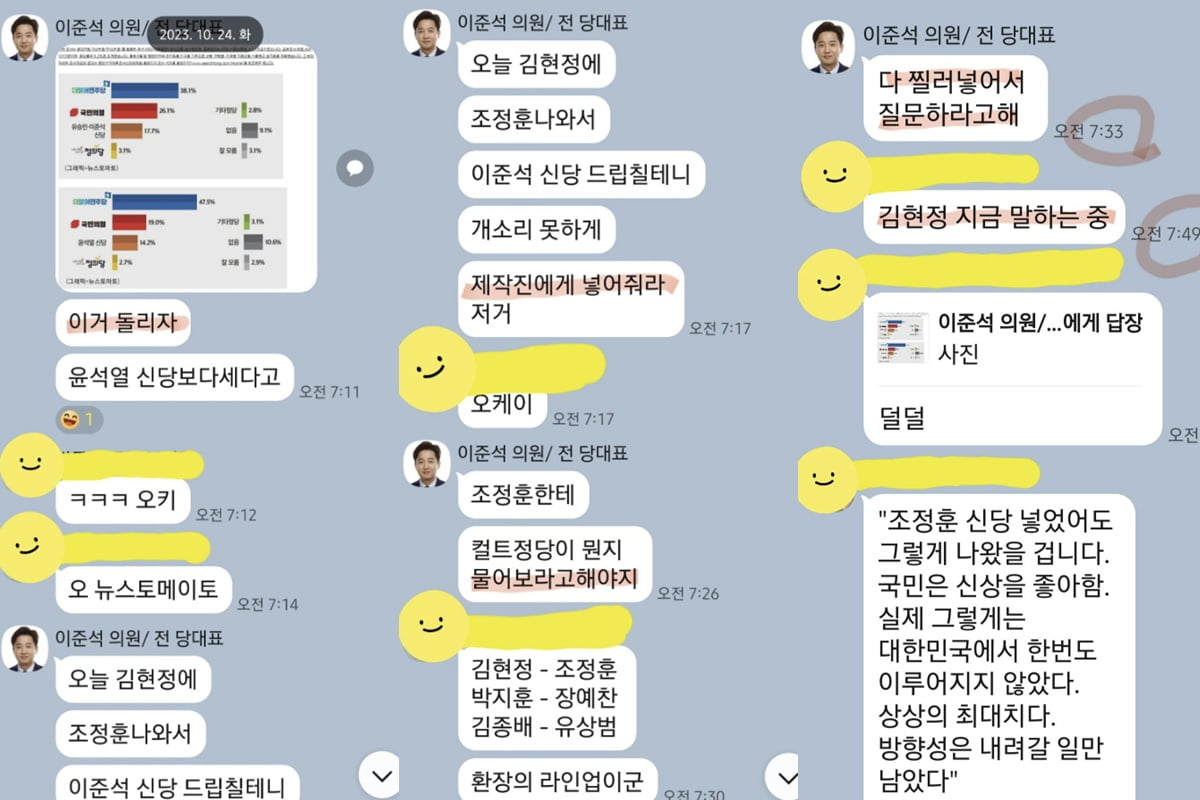 이 의원과 관계자들의 대화가 이뤄진 시점은 2023년 10월 24일 화요일 오전 7시 11분~7시 50분으로 대화에 등장한 '김현정의 뉴스쇼', '뉴스킹 박지훈입니다' 등의 생방송 시간과 겹쳤다.