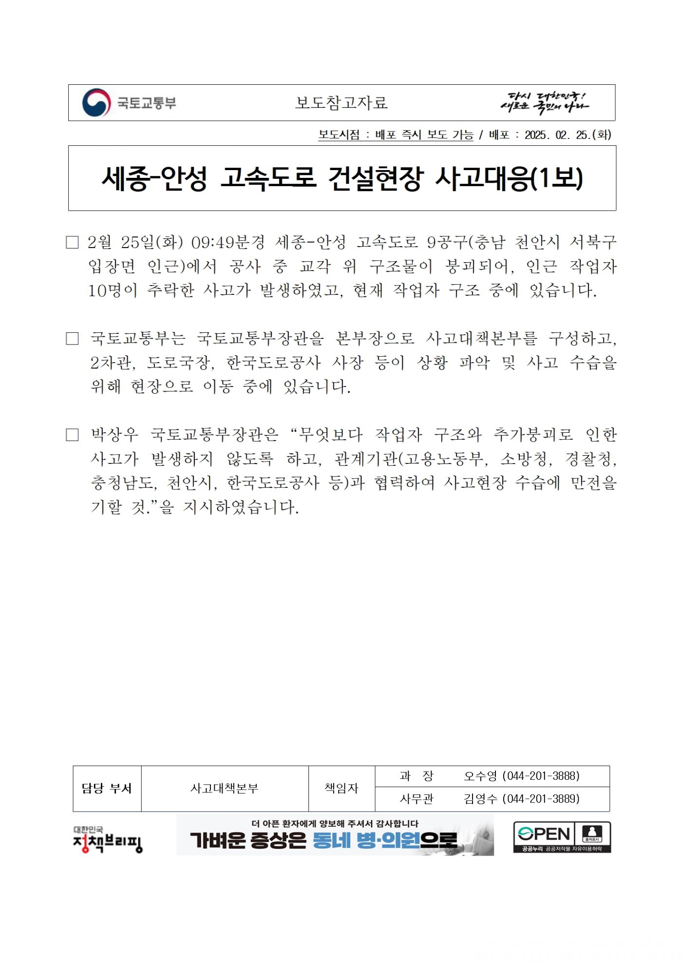 안성시 고속도로 공사장 붕괴…소방 당국 "3명 사망·7명 부상"(종합)