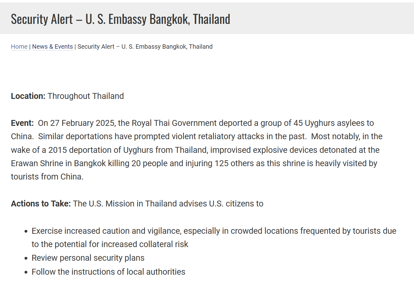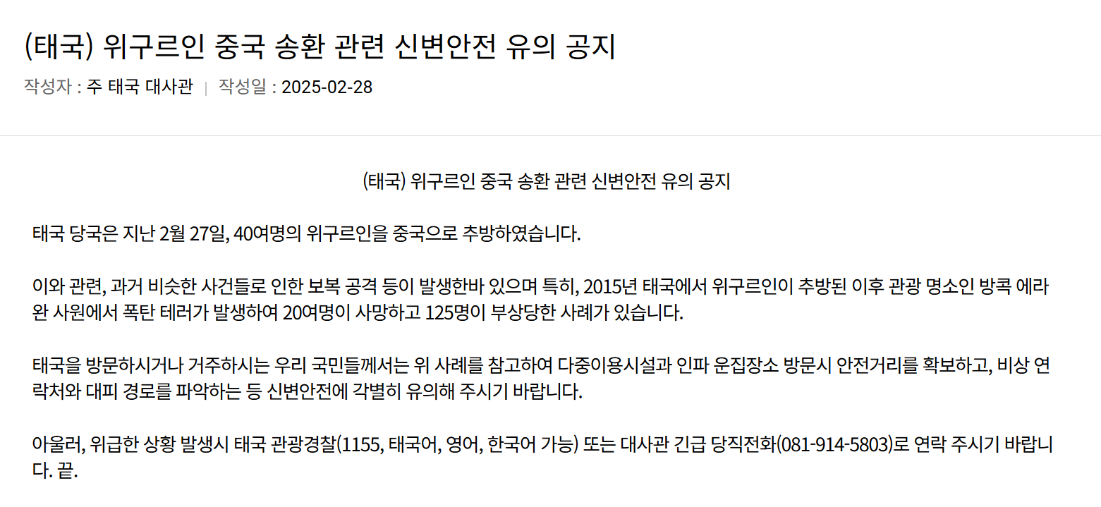지난 27일 태국에서는 2014년 중국에서 탈출해 튀르키예로 망명을 시도하다 경유지인 태국에서 11년간 구금되어 있던 위구르족 40여 명을 중국으로 강제 송환했습니다. 2015년처럼 폭탄 테러가 있을 가능성이 있기에, 중국 관광객이 많이 찾는 인파 운집 관광지 등은 당분간 피하는 것이 좋을 것 같습니다.