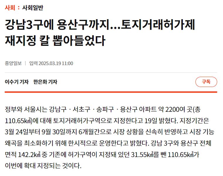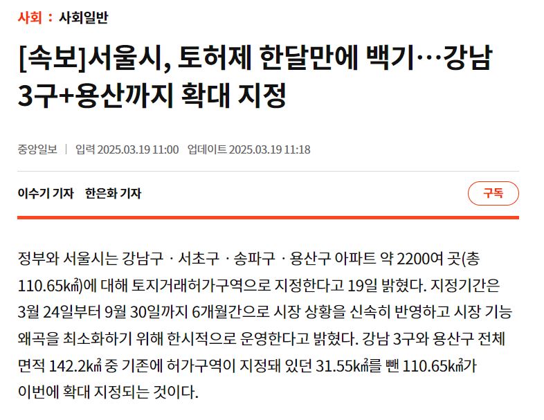 [속보]서울시, 토허제 한달만에 백기…강남 3구+용산까지 확대 지정 [출처:중앙일보] https://www.joongang.co.kr/article/25321713