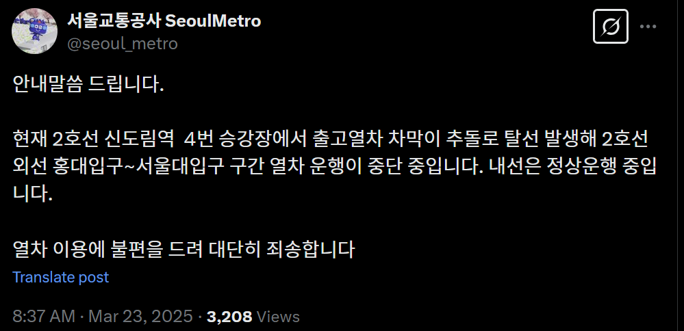 Subject   지하철 2호선 신도림서 탈선…홍대입구∼서울대 외선 운행 중단