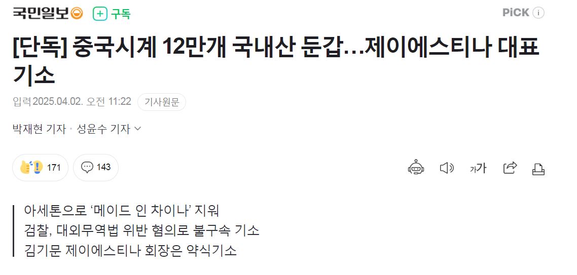 Subject   중국시계 12만개 국내산 둔갑…제이에스티나 대표 기소
