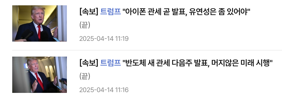 | Subject | 스마트폰·반도체 관세 혼선…직접 나선 트럼프 "예외 없다" |