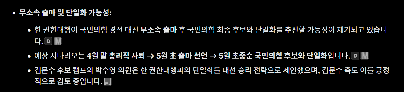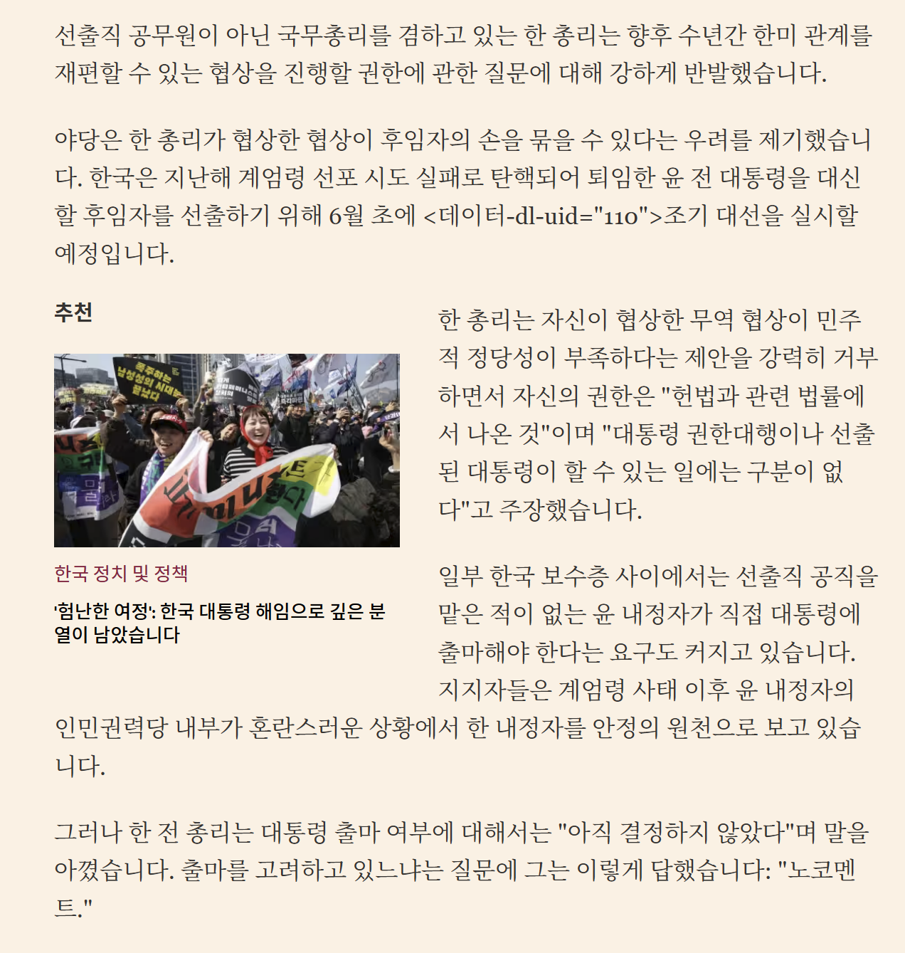 선출직으로 당선된 적이 없는 (윤이 임명한) 한 권한대행이 대선에 출마해야 한다는 소리가 보수 일각에서는 커지고 있다는 내용입니다.  인민권력당=국민의힘.