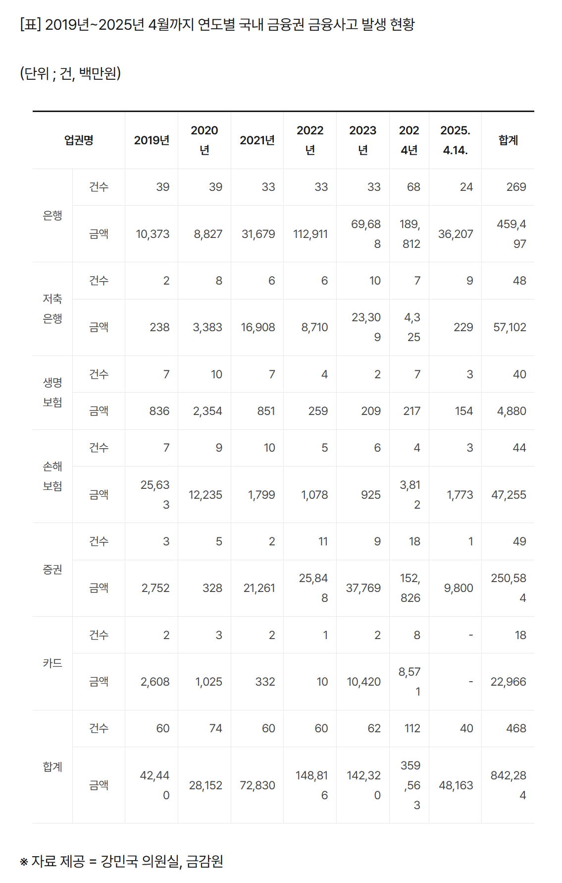 | Subject | 횡령·배임 등 금융사고액 6년여간 8천423억…"작년 역대 최고"(종합) |