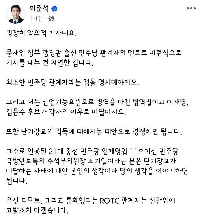 참고로 이준석은 더팩트와 ROTC출신 군관계자를 선관위에 고발조치하겠다고 했네요.