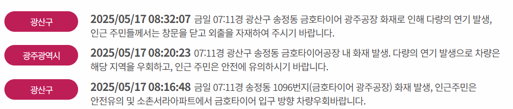 https://www.yna.co.kr/view/AKR20250517020556054 *종합기사로 수정했습니다. https://www.yna.co.kr/view/AKR20250517034100054 대피해서 인명피해는 확인되지 않았다고 합니다. 고무 타는 냄새가 상당할 것 같군요. == 직원 한 명이 고립되어 있다고 합니다. 무사히 구조되기를 기원합니다. == https://www.yna.co.kr/view/AKR20250517020500054 속보라 내용은 없습니다. 무사히 구조했답니다. 0