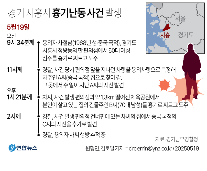 경찰, 시흥 흉기사건 용의자 50대 중국동포 차철남 공개수배 https://www.yna.co.kr/view/AKR20250519142000061 지금 시흥에서 두명을 살해하고 두명을 칼로 찌른 혐의로 공개수배된 차철남이라는 남성이 자전거를 타고 도주중이라고 시흥경찰서에서 긴급하게 공개수배했습니다. 오늘 하루동안 두사람을 칼로 찔렀고, 그외 다른 두 사람을 최근 며칠 사이에 살해한것으로 보인다고 합니다. ===================================================================================== 검거되었다고 합니다. [1보] 경찰, 시흥 흉기사건 용의자 차철남 검거 https://www.yna.co.kr/view/AKR20250519146600061 =========================================================================== 하루종일 있었던 소동을 연합뉴스가 종합기사를 냈기에 갈음합니다. 시흥 흉기사건 용의자 중국동포 차철남 긴급체포…범행 시인(종합) https://www.yna.co.kr/view/AKR20250519146652061 아침에 편의점 주인(A)이 칼에 찔리는 일이 있었고 그 범인을 찾기위해 범행시점 편의점을 지나간 검은 승용차의 차주(B)집을 찾아갔으나 B씨는 자기 집에서 숨진채 발견 그뒤 오늘 오후, 차철남의 집주인인 C씨가 차철남에게 칼에 찔리는 사고가 발생 차철남의 집에 찾아간 경찰은 그 집에서 숨진 D씨의 시신을 발견 B씨와 D씨는 형제사이로 추정된다고. 두건의 시신과 두건의 칼부림 사건의 용의자가 동일한 사람이라고 판단한 시흥경찰은 긴급수배를 통해 결국 최초 A씨가 칼에 찔리는 사고가 있은지 10시간만에 차철남을 검거했습니다. 오늘밤 시흥경찰서에서 야간 조사를 실시할 계획이라고 합니다. 1