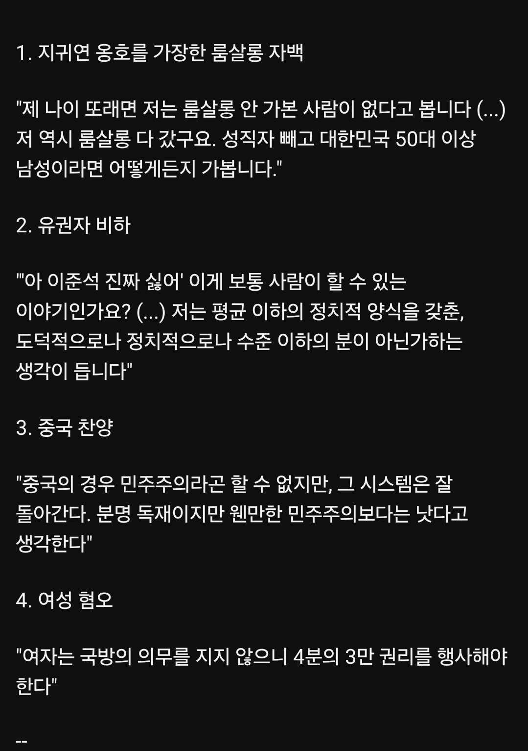 https://v.daum.net/v/20250522074621394 [함 위원장은 관련해 "아주 형편이 어려워서 못 간 분들은 있겠지만 사회생활을 하다 보면 이런저런 인연으로 룸살롱을 가게 된다"며 "옛날에 안철수 (국민의힘) 의원이 '단란주점이 단란하게 노는 덴가요' 하면서 그런 데 안 가는 것처럼 얘기했지만 저 역시 가고, 50대 이상 대한민국 남성이라면 어떻게든 가본다"고 주장했다.] 함익병은 예전부터 말실수가 많았는데, 이번에도 민주당 비판하려다 똥볼을 차버리네요. 설령 이준석이 대선에서 승리하더라도 이준석 정부 인사에 대해서는 별 기대가 안됩니다. 0