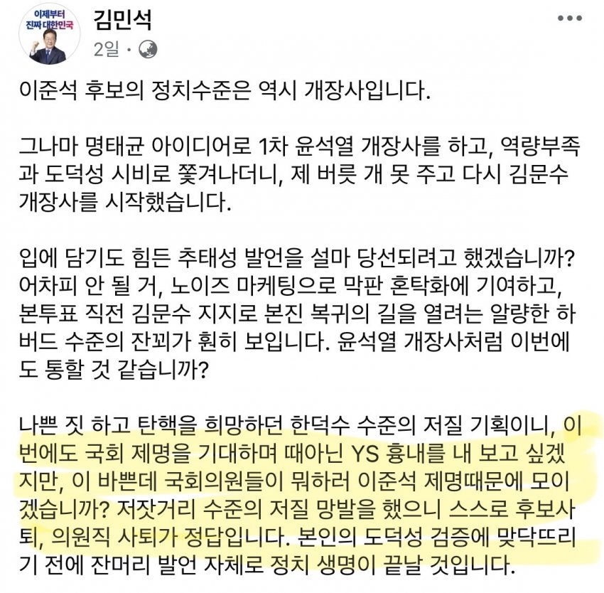 이 후보는 “이 싸움은 전선이 분명하다”며 “이재명 같은 독재자, 유시민 같은 궤변론자, 김어준 같은 음모론자와의 싸움이다. 이제 그들이야말로 정치권을 떠나고 젊은 세대가 나라를 이끌 수 있도록 이번 선거에서 심판해야 한다”고 강조했다.