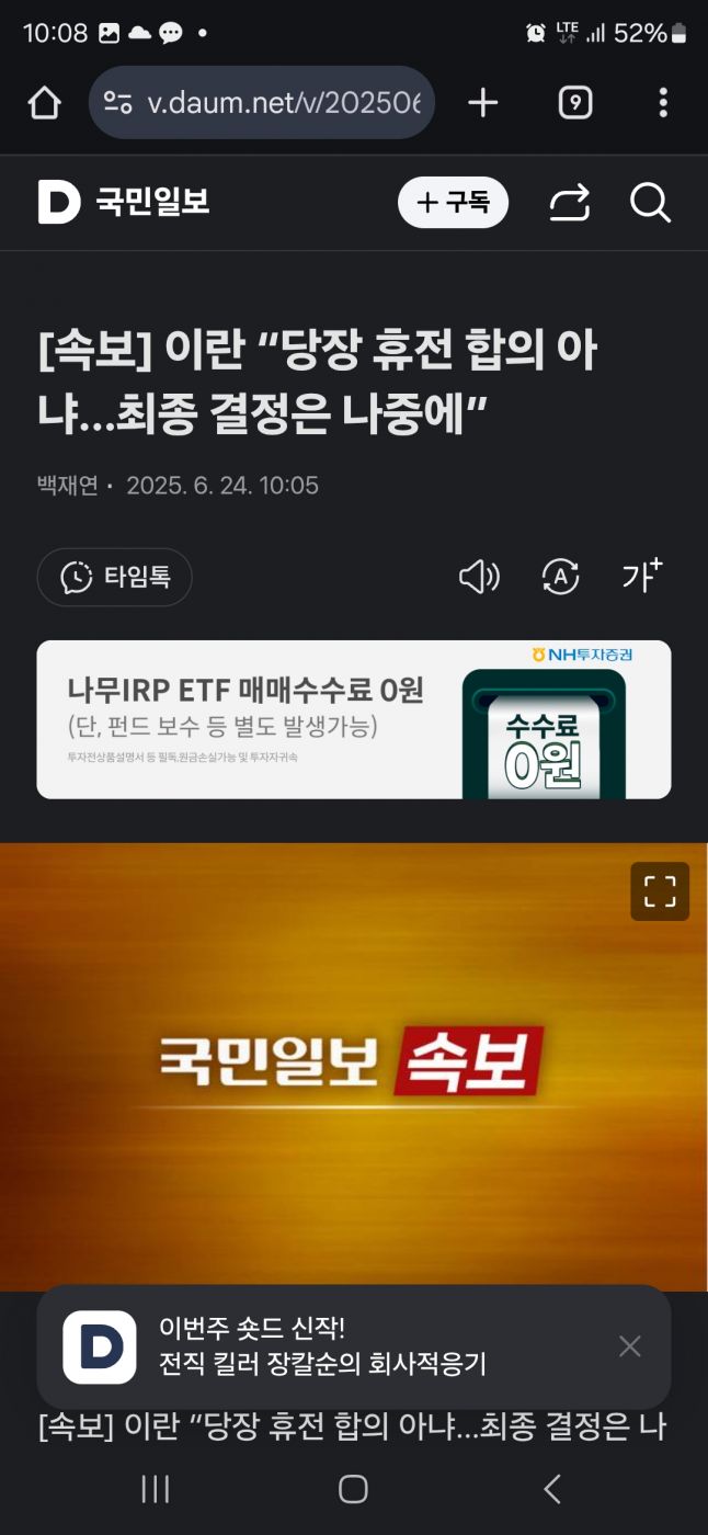 https://v.daum.net/v/20250624100508214 제 생각에는 저는 트럼프한테 말린거 같습니다. 미국은 빠져나갔고 이제는 해협 봉쇄도 없고 서로 장기전 가는거라고 생각해서 중동만의 문제로... 우러전쟁처럼 될거 같네요. 1