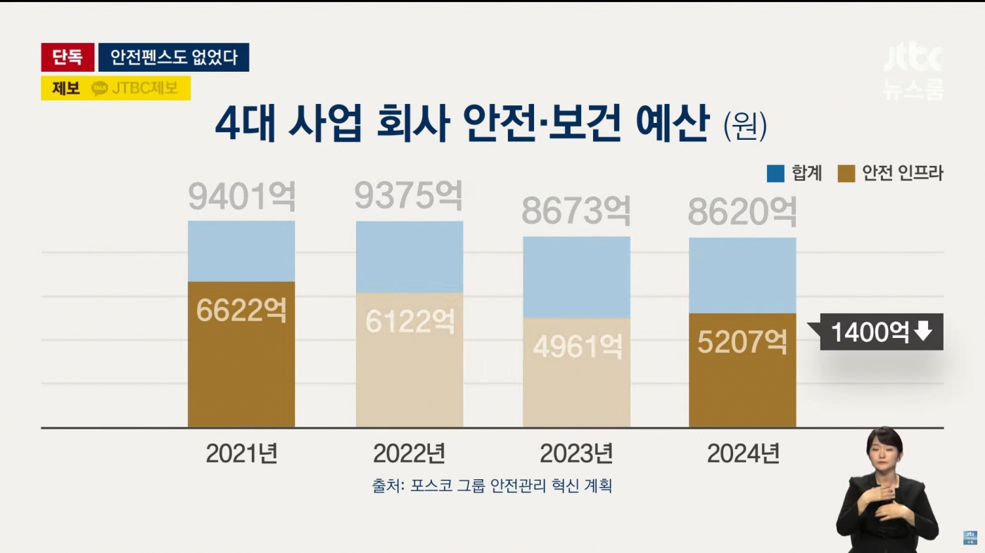 [단독] '안전예산' 계속 줄여온 포스코…사고 현장엔 펜스조차 없었다 https://news.jtbc.co.kr/article/NB12257721 JTBC가 이번에 포스코 그룹 안전관리 혁신계획.이라는 문서를 입수했는데 지난 2021년 대비 2024년 안전/보건 예산은 1400억이나 감소했다고. 대통령이 면허 취소와 공공입찰금지 등 모든 방안을 찾으라고 지시한 가운데 왜 유독 포스코는 올해 사고가 많았는지에 대한 정황도 차츰 나오고 있는것 같습니다. 0