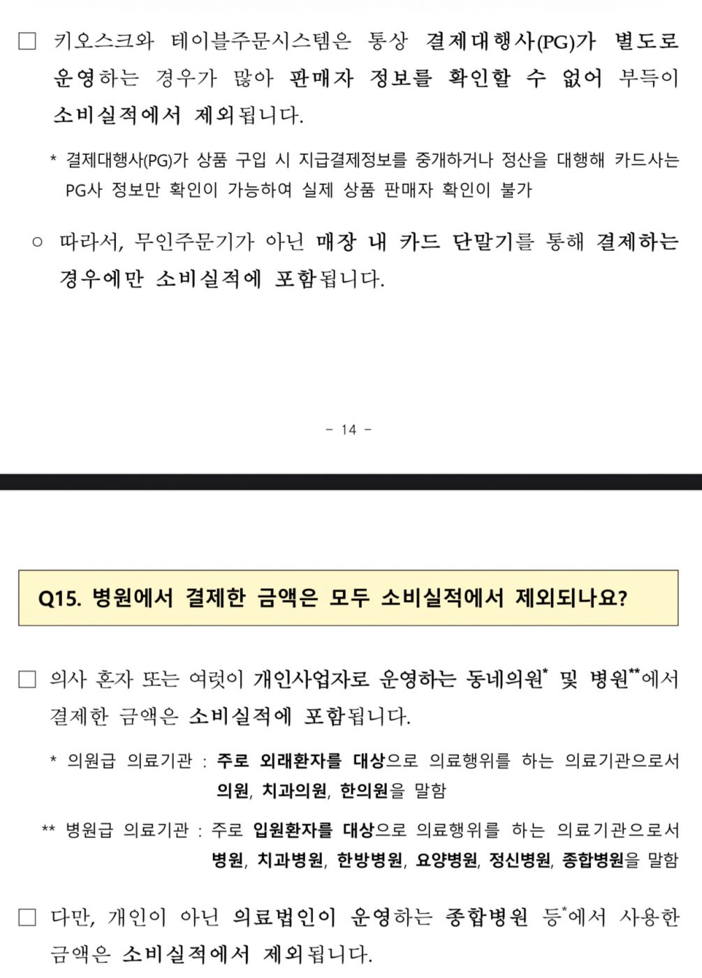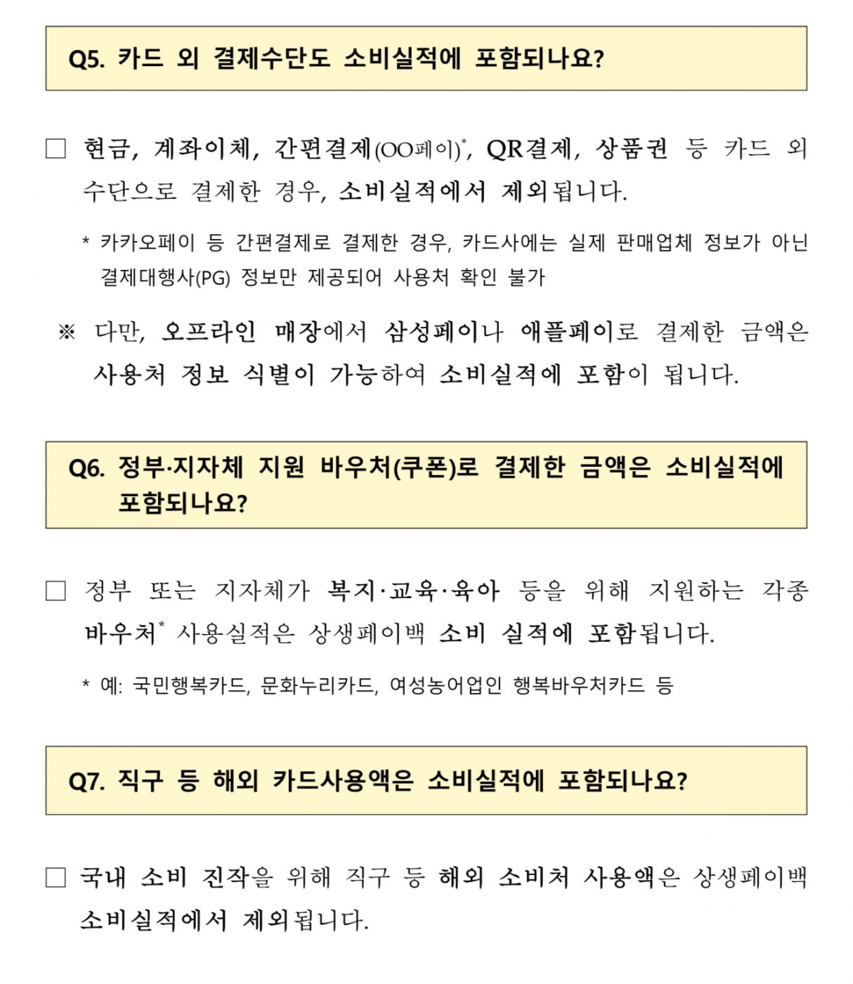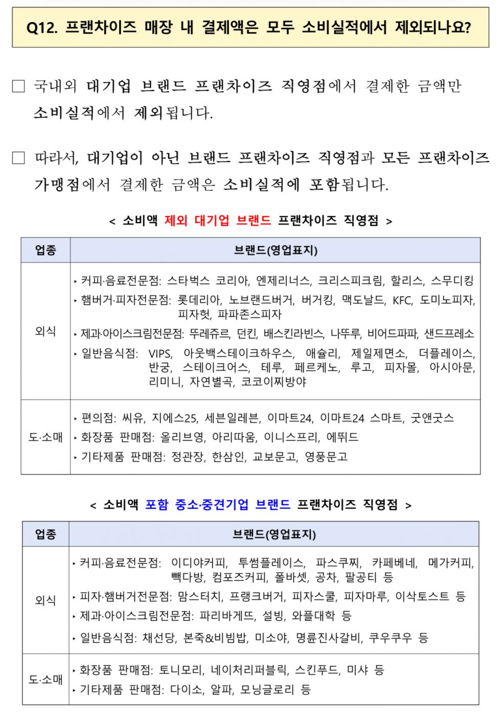 - 소비액 불인정 사용처 : 대형마트, 백화점, 유흥업소, 쇼핑몰/홈쇼핑 등 온라인 거래, 대기업 프랜차이즈 직영점 등