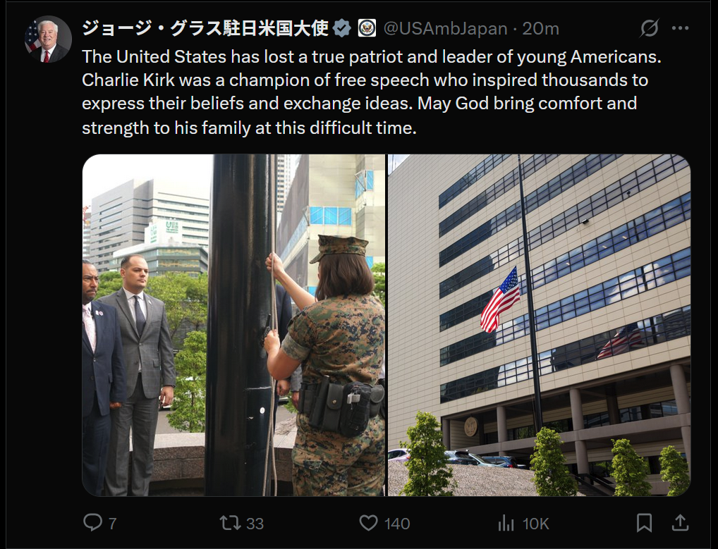주일 미 대사관은 대사가 조의를 표하고, 조기 게양했습니다. 주한 대사관도 조기 게양했습니다. (트럼프 대통령이 순교자로 규정하며, 9월 14일 일몰 전까지 미국 내와 해외공관 등에 조기 게양을 지시했습니다. + 9.11은 Patriot Day라 원래 조기 게양을 매년 했습니다. 벌써 9.11 24주년이군요.)