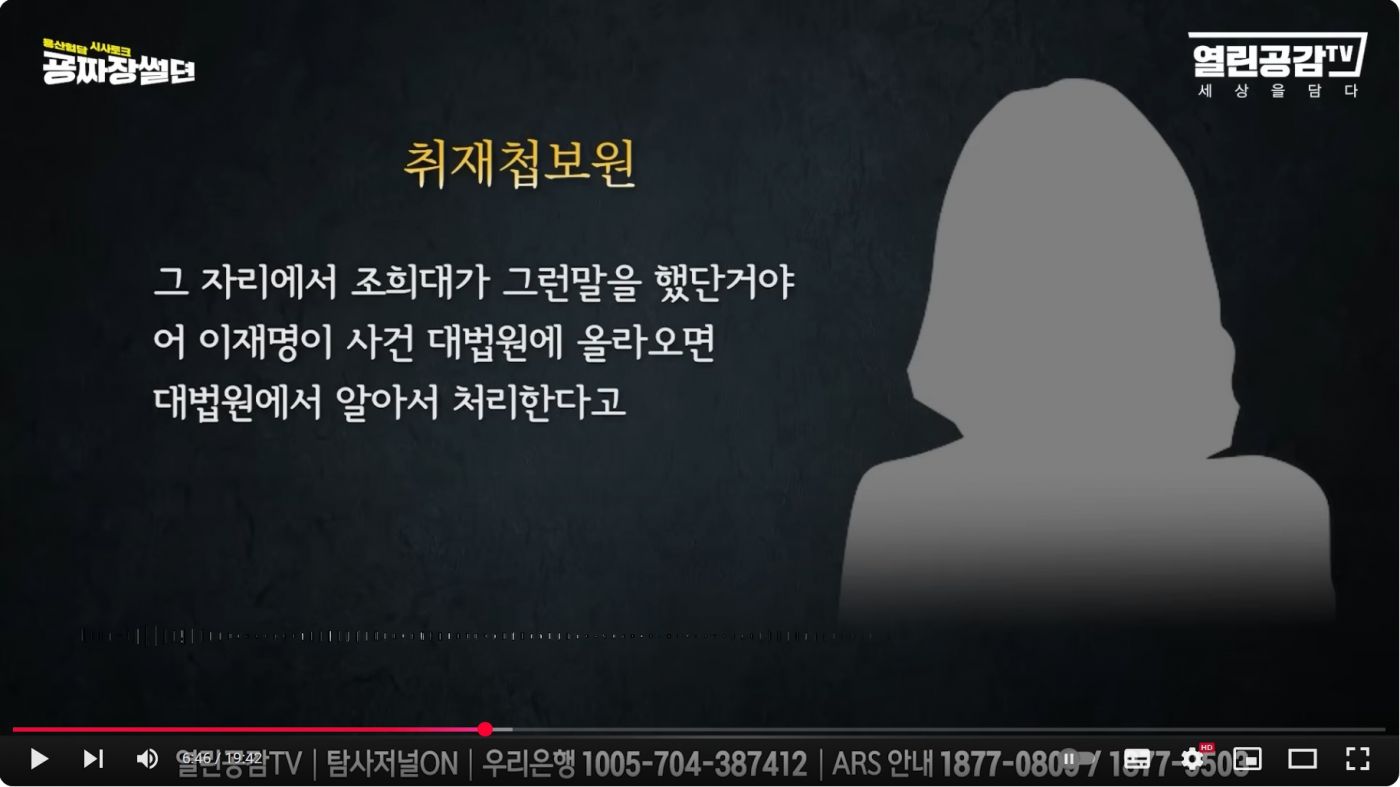 조선일보 https://www.chosun.com/politics/politics_general/2025/09/18/BINVMZ5VOFFAZCEQG2USSL6T2Q/ ![]() ///해당 녹취 음성은 지난 5월 10일 유튜브 ‘열린공감TV’가 ‘취재 첩보원’의 제보라며 처음 공개했다. 음성 속 인물은 “이야기를 들었는데, 4월 4일 윤석열 탄핵 선고 끝나고, 4월 7일인가 4월 10일인가 15일인가. 조희대, 정상명(전 검찰총장), 김충식(김건희 여사 모친의 측근), 한덕수(전 국무총리) 4명이 만나서 점심을 먹었다”며 “그 자리에서 조희대가 ‘이재명 사건 대법원에 올라오면 알아서 처리한다’는 이야기를 했다”고 했다. 유튜브 진행자는 해당 녹취를 공개하며 “아직까지는 ‘주장’이다. 주장이라는 점을 염두에 두라”며 “제발 고소·고발 좀 그만하시라”고 했다. 서영교 의원은 나흘 뒤인 지난 5월 14일 국회 법제사법위원회에서 이 음성을 그대로 틀며 “제보를 받았는데, 윤석열 탄핵 이후 정상명, 한덕수, 김충식, 조희대 4인이 회동했다고 한다”고 했다. ‘열린공감TV’는 당시 방송에서 “해당 음성은 AI로 제작된 것으로 특정 인물이 실제 녹음한 것이 아님을 알려드린다”고 공지했다. 하지만 이 사실은 그동안 주목받지 못하다가 최근 민주당이 조희대 대법원장의 사퇴를 본격적으로 압박하고 나서면서 재조명됐다. 서 의원은 조선닷컴과의 통화에서 국회에서 공개한 녹취록이 AI 음성이라는 사실을 알았느냐는 질문에 “우리가 따로 받은 제보도 있다”며 “그 모든 것은 수사를 해서 확인하면 된다”고 했다. 서 의원은 녹취록이 AI 음성이라는 사실을 알았느냐고 다시 묻자 명확한 답변을 하지 않으며 “일정이 있어서 길게 통화하기 어렵다”고 했다./// 야당 인사들이 주장하는 것처럼 서영교가 틀었던 녹취가 AI음성이라는 말은 아마 사실은 아닐겁니다. 열린공감TV 방송에 저런 고지가 존재하기는 하지만 해당부분은 '첩보원'이라는 사람의 육성이 맞는 것으로 보입니다. ![]() ![]() ![]() AI음성 부분도 있긴 한데 그건 해당 부분이 아닌 다른 취재원의 제보를 AI로 재현했다고 표시한 부분이 나오거든요. ![]() 하지만 그 첩보원의 '녹취'라는 건 별로 의미있는 녹취가 아니죠. 보도자료로서 녹취가 의미 있는 것은 회동이 있었다면 그 현장에서의 녹취라든지 적어도 그 현장에 참석한 사람의 녹취여야 가치가 있습니다. 아무 관계 없는 사람이 그 사람이 그렇다고 카더라라고 한 얘기를 녹취한 것은 아무런 가치가 없어요. 그냥 제보 내용만을 명료하게 정리해서 전달해도 충분합니다. 여기에 '녹취'라는 이름을 입혀서 국회에서 대단한 증거처럼 공개한 서영교 의원은 좀 반성해야 합니다. 열린공감은 원래 그런 채널이에요. 별로 의미 없는 소스도 녹취라는 이름으로 포장해서 사골끓이고 조회수 챙기는... 근데 이 부분이 AI음성이냐 아니냐는 별로 중요한 게 아니죠. 아마도 세상은 서영교가, 부승찬이 AI음성 가지고 헛발질한 걸로 기억할 겁니다. 중요한 건 헛발질한 거지, AI음성이냐는 건 양념일 뿐이까요. 사법개혁은 꼭 필요하고, 제대로 해야죠. 근데 개혁을 하겠다고 나서는 이들이 이따위 망발을 하면 개혁은 커녕 개혁대상에게 삼켜질 겁니다. 이미 조국의 검찰개혁 때 그걸 충분히 목도했어요. 그의 검경수사권 조정은 고개를 갸웃거리게 하는 면이 많았지만, 무슨 심모원려라도 있을까 싶었는데, 그런 건 전혀 없더군요. 칼자루를 쥐고 있는 상대에게 내가 옳으니까 칼을 내놓으라고 아무리 고함을 질러도, 돌아오는 건 칼빵이죠. 열린공감TV 보다도 못한 작자가 거대여당의 원내대표가 될 뻔했다는 게 아찔합니다. 이런 식으로 사법개혁을 다루다가 '검찰공화국 개추' 2탄을 보게 될까 두렵네요. 3