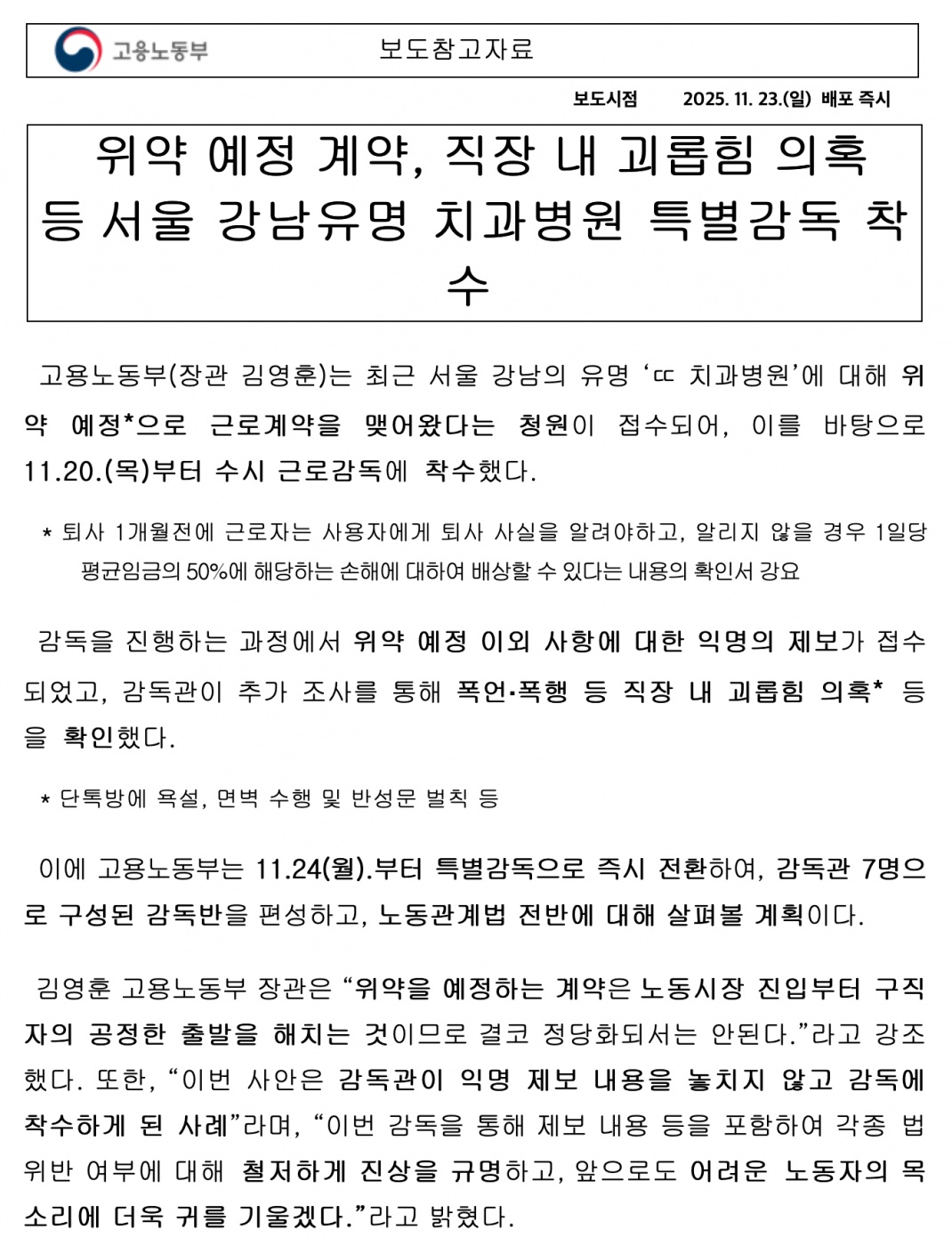 이에 고용노동부는 오늘부터 해당 병원에 대한 특별감독에 들어가기로 했습니다.