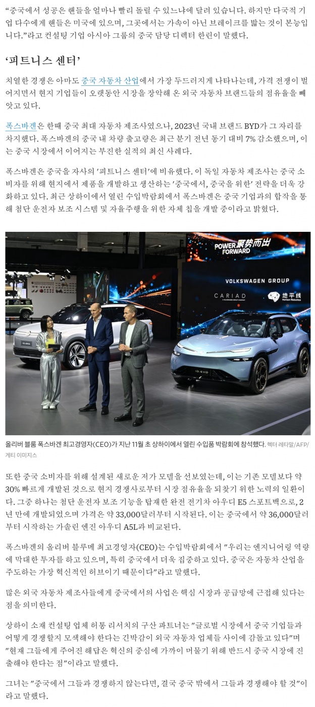 https://www.donga.com/news/Economy/article/all/20251215/132967734/1 볼크스와겐은 남들보다 최소 15년은 이상 앞서서 듕괵에서 꿀을 빨아왔읍니다. 듕괵 시장 진출의 역사가 자동차뿐만 아니라 전 업종에서도 독보적으로 빠르고, 압도적이었지요. 그 역사가 2010년대부터 흔들리더니, 이제는 완전히 밀려나서 끝나고 있는 거지요. 우리나라가 2010년대 중반에 한한령 기점으로 쳐맞던 걸 구라파는 이제 본격적으로 맞고 있고, 그 결과 독일부터 코로나 이후 나락을 가고 있는게 아닌가 합니다. 여담으로 연합뉴스는 독일 공장 폐쇄 이런 식으로 처음에 제목을 지어놔서, 독일에 폭스바겐 공장이 더 없는거처럼 오독하기 쉽게 제목을 썼더군요. 그게 거지같아서 잘 안갖고오는 동아일보 기사로 갖고왔읍니다. 0