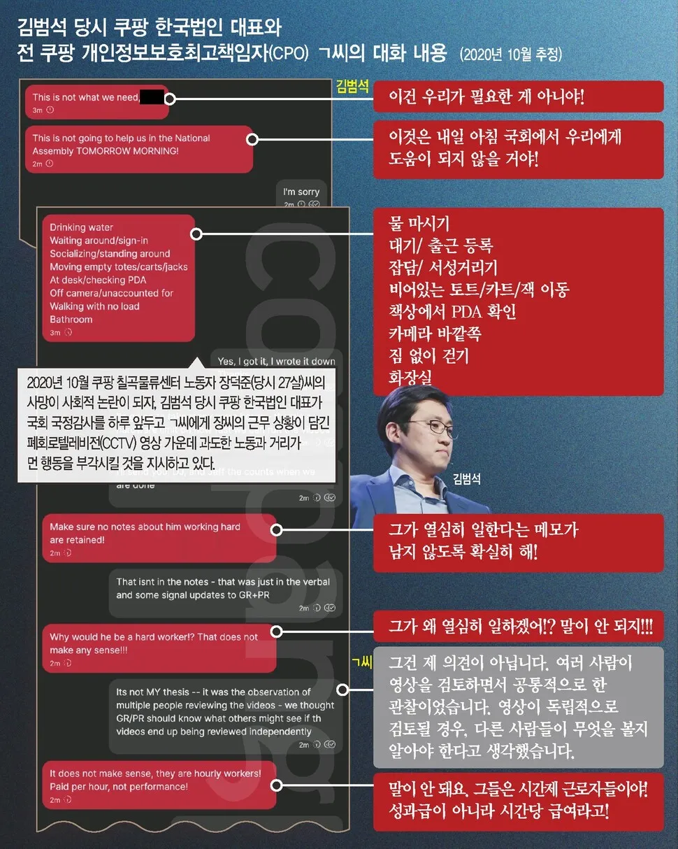 | Subject | ‘과로사 CCTV’ 본 쿠팡 김범석 “시급제 노동자가 열심히 일하겠어?” |