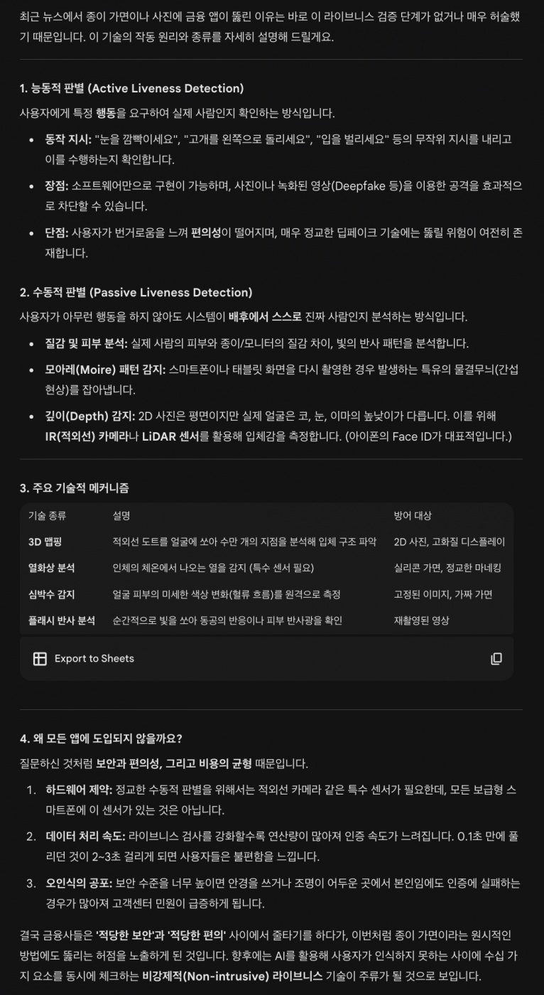 https://www.yna.co.kr/view/AKR20251219072300017 다른 뉴스지만, https://youtube.com/shorts/6_EnEMjtJSk?si=uPBJ1uZYgqWihv3G 안면 인증, 얼굴 인식, 신분증 사진 대조도 회사/서비스마다 기술이나 보안 정도가 다른 것으로 아는데, 휴대폰 비대면 개통의 경우, 추가 보안이면 없는 것보다는 나으려나요? 은행 앱 같은 경우 비용 문제 혹은 보안과 편의는 트레이드-오프 관계라 너무 인식/인증이 안 되면 소비자들 민원이 늘어서 쉽게 인증되게 해둔 것이려나요? 라이브니스(Liveness)기술은 빠진 것 같은데. 0