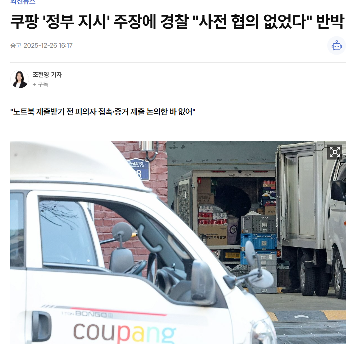 Subject   속보)쿠팡 '정부 지시' 주장에 경찰 "사전 협의 없었다" 반박