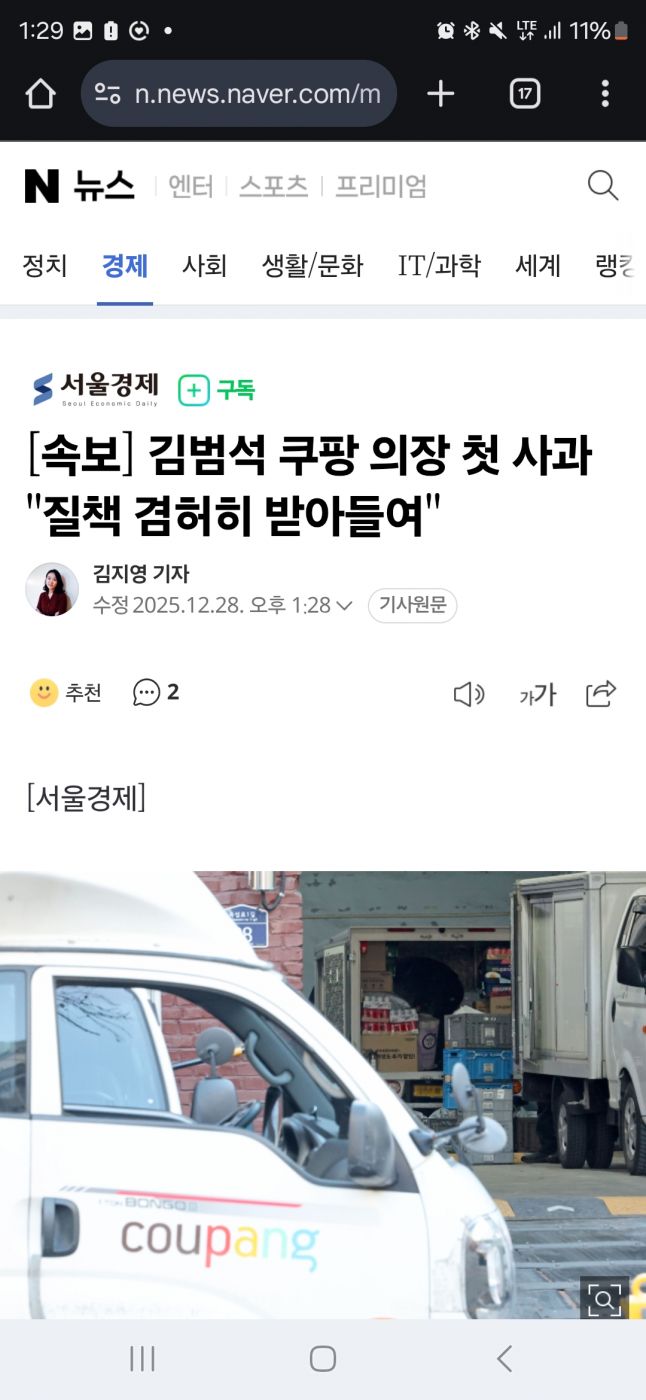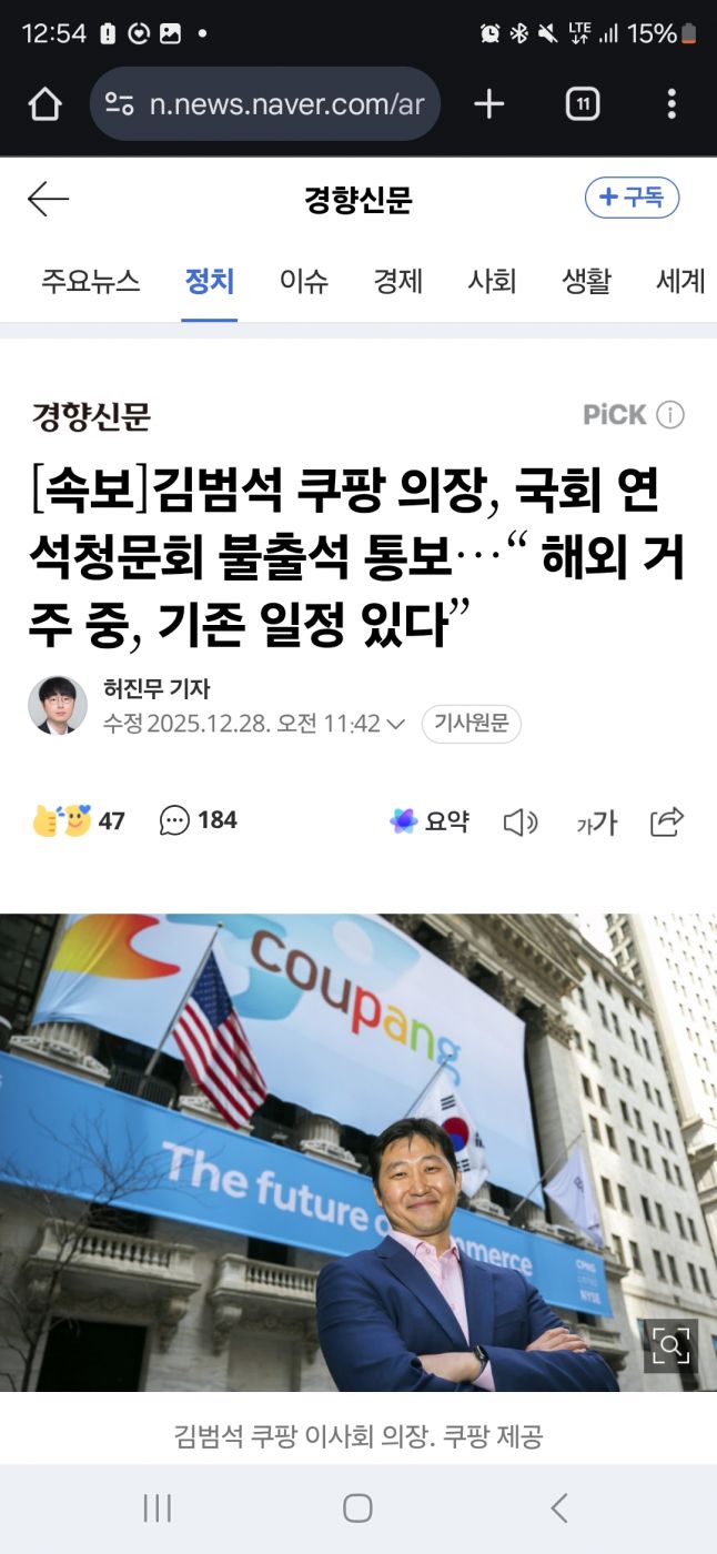 경제속보]김범석 쿠팡 의장, 국회 연석청문회 불출석 통보…“ 해외 거주 중, 기존 일정 있다” 22 |
