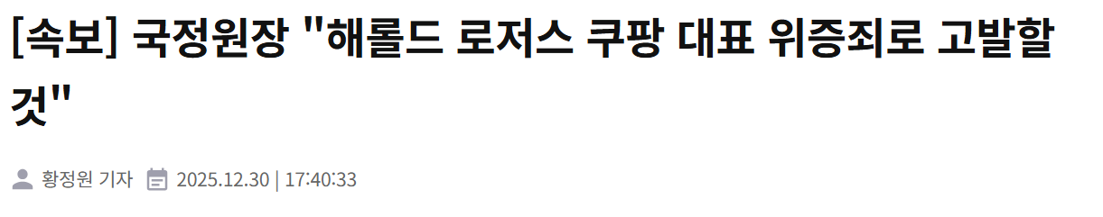 Subject   국정원장 "해롤드 로저스 쿠팡 대표 위증죄로 고발할 것"