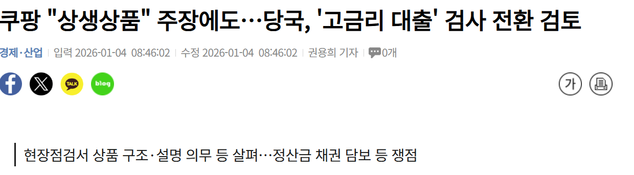 Subject   쿠팡 "상생상품" 주장에도…당국, '고금리 대출' 검사 전환 검토