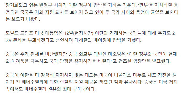 중국은 베네수엘라도 그렇고 이란에도 립서비스만 열심히 하던데..