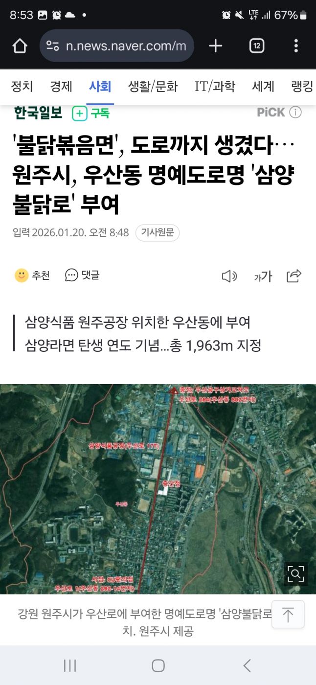 사회불닭볶음면', 도로까지 생겼다…원주시, 우산동 명예도로명 '삼양불닭로' 부여 2 |