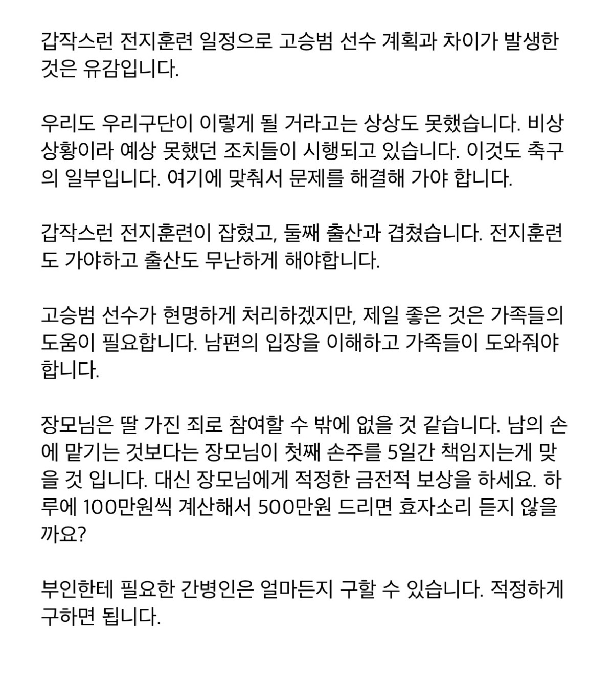 여기에 폭언도 들었다는 입장이다. 구단 내 누군가 “제왕절개는 하루이틀이면 낫고 걸을 수 있다”는 식의 발언을 했다고 한다. 울산이 ‘전원 전훈 참여’를 고수하자 결국 고승범은 출산 전날 밤과 다음날 오전에 왕복 10시간 거리를 직접 운전해 훈련을 소화했는데 여기서도 “넌 고액 연봉자니까 (피로는) 감수하라”는 식으로 일관했다고 주장한다.