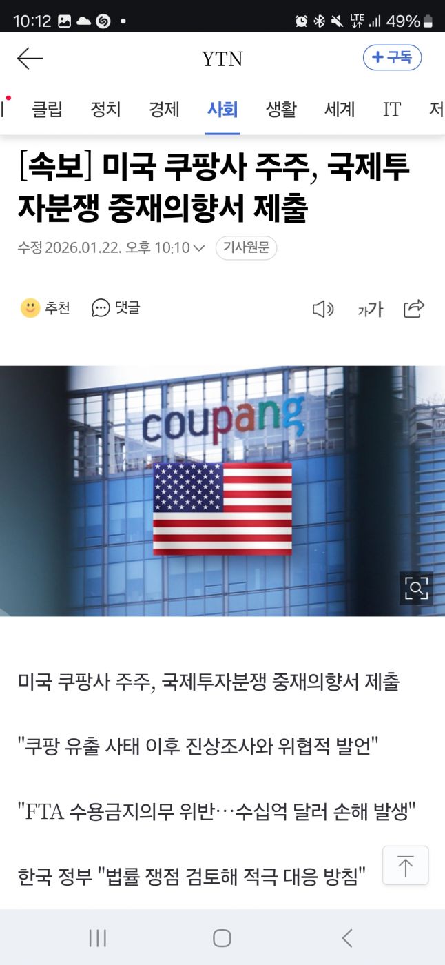 | Subject | 속보] 미국 쿠팡사 주주, 국제투자분쟁 중재의향서 제출 |