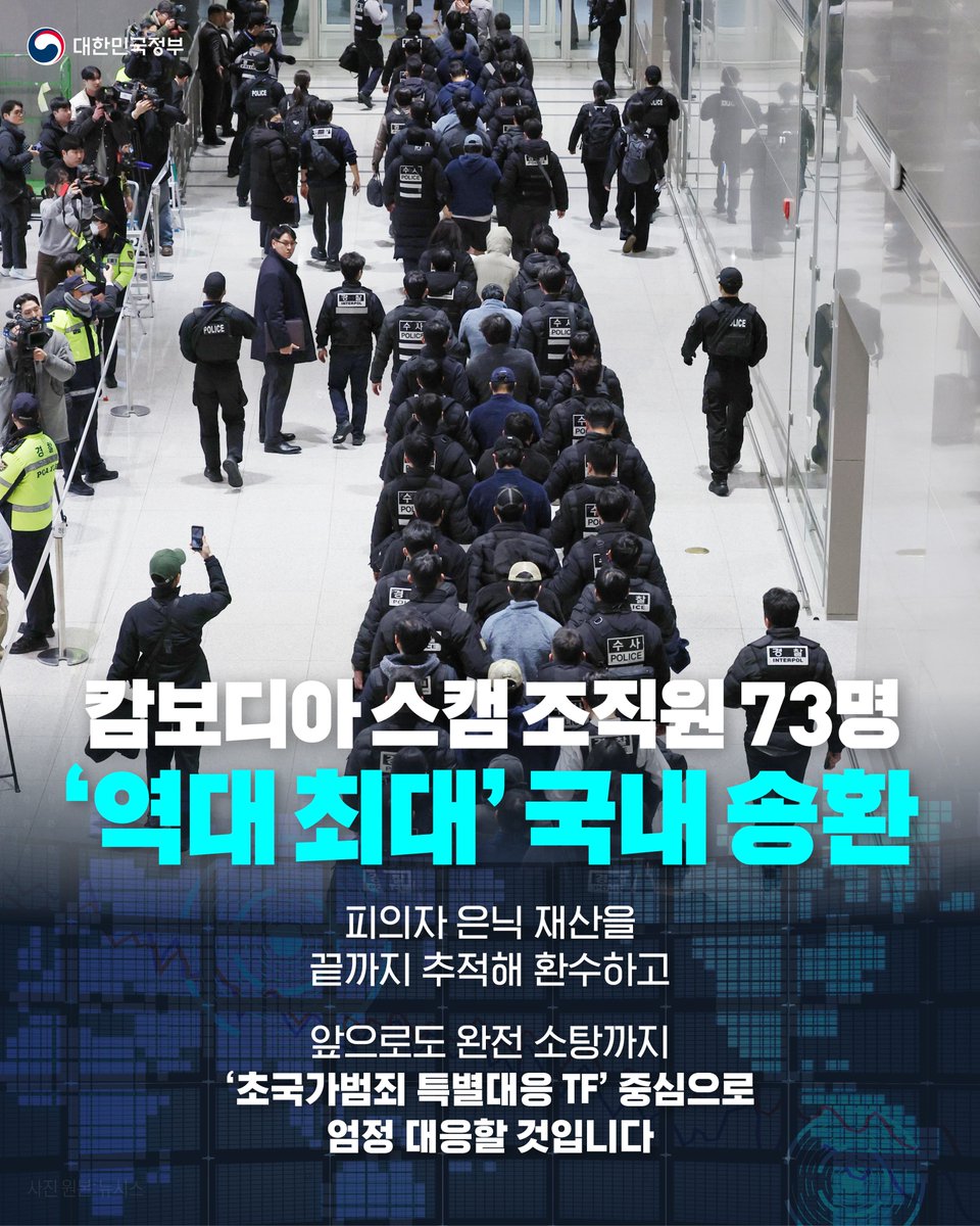 경찰청과 정부가 캄보디아에 파견한 코리아 전담반이 현지에서 135명을 검거해서 73명을 전세기에 태워 싸그리 한국으로 붙잡아들였네요