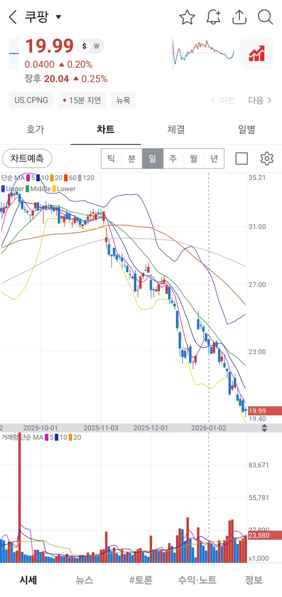 쿠팡 주가가 바닥을 치고 있습니다.