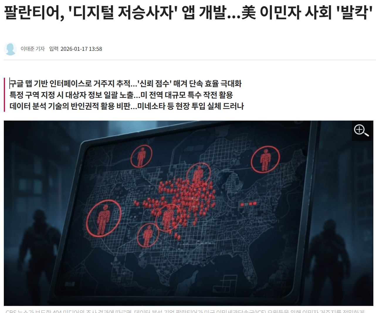 4456 국제팔란티어, '디지털 저승사자' 앱 개발...美 이민자 사회 '발칵' 17 활활태워라 26/01/26 1335 0