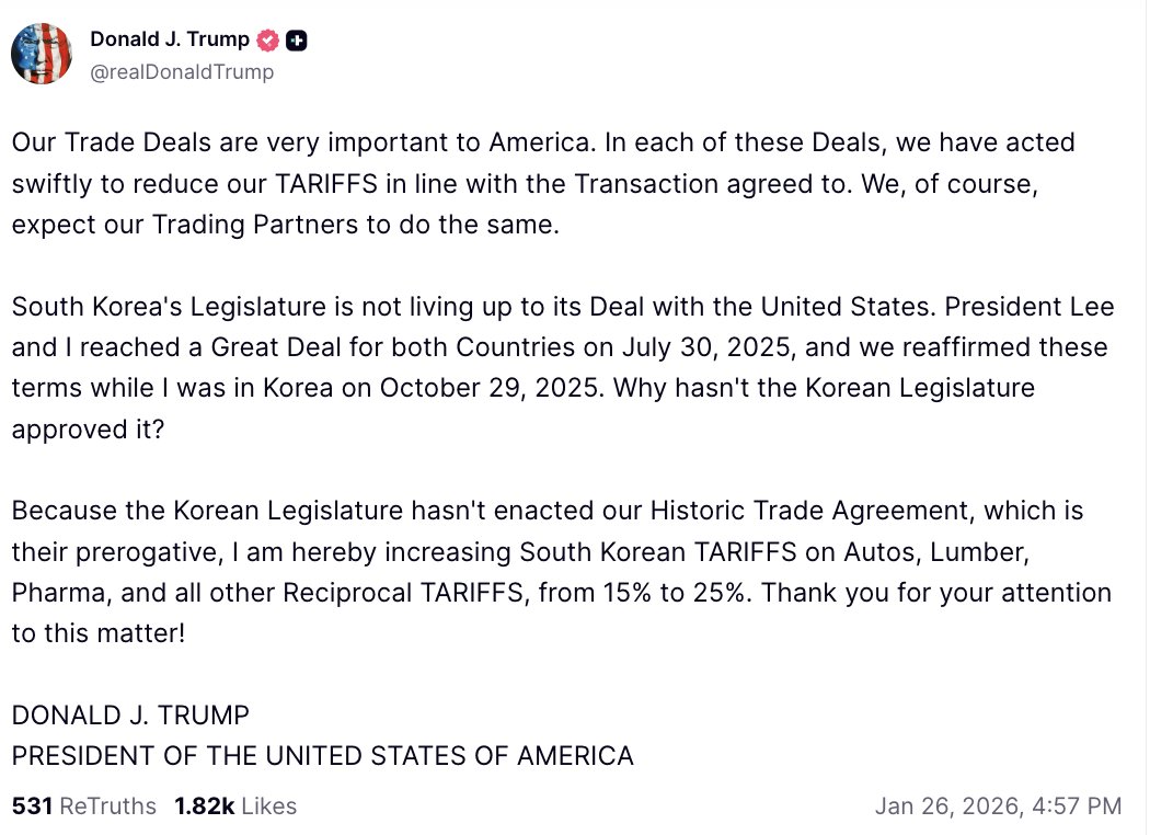 국제트럼프 "韓 車·상호관세 15→25% 인상…韓국회 합의이행안해"(종합) 28 |