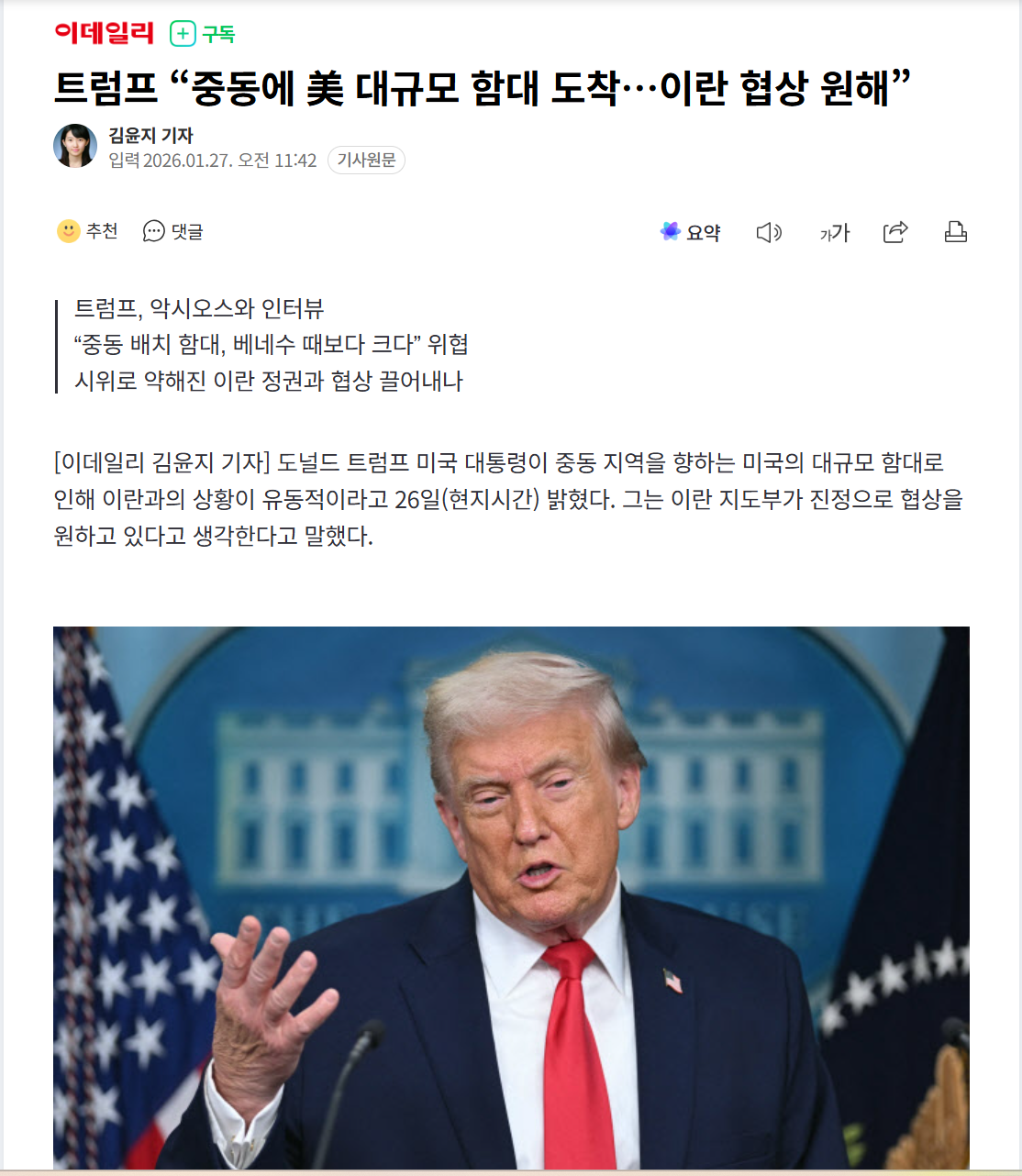 Subject   트럼프 “중동에 美 대규모 함대 도착…이란 협상 원해”