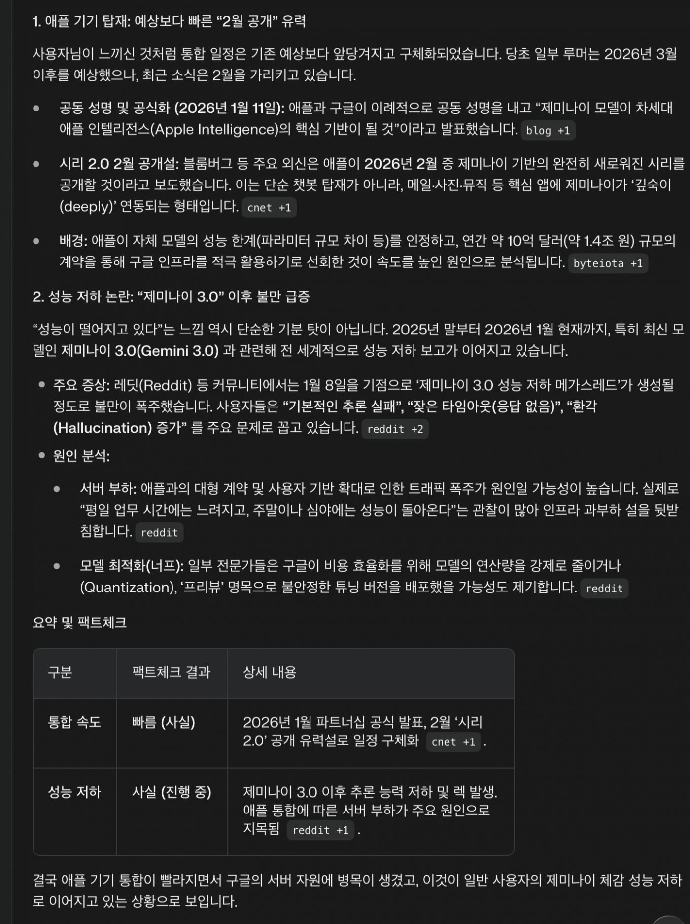 제미나이 애플 기기 탑재가 생각보다 빨라질 것 같은데, 사용자가 늘어서인지, 성능은 떨어지고 있는 느낌입니다.
