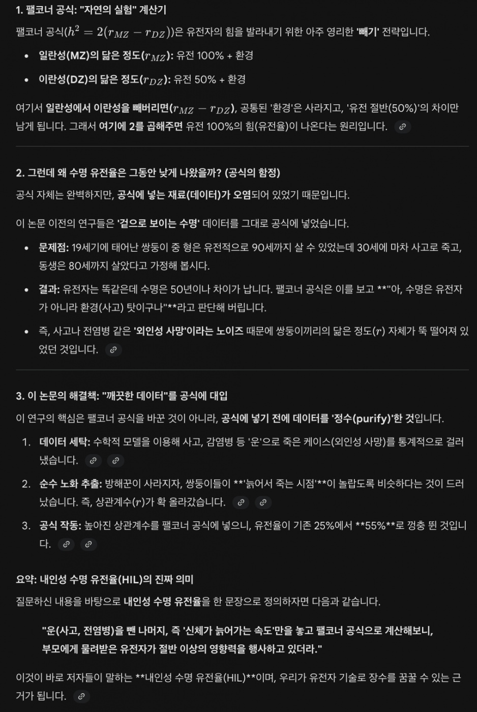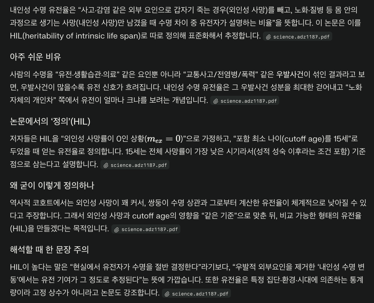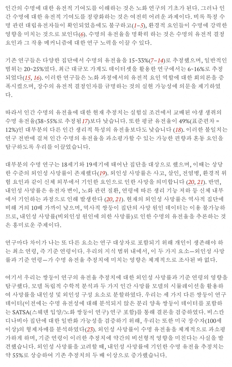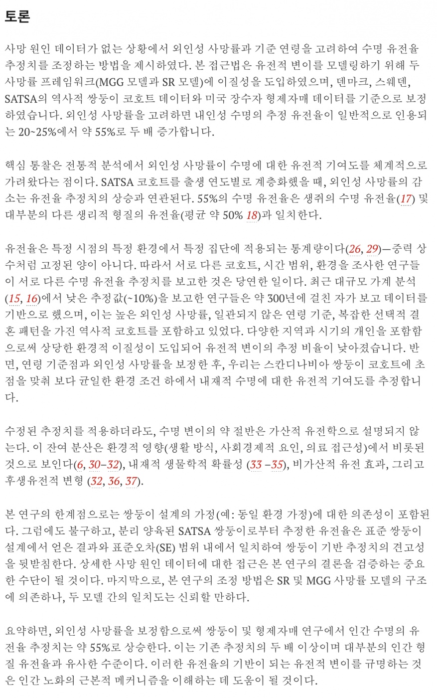 기존에 많이 인용되었던 연구 데이터들에서 외인성 사망 등 노이즈를 통계적으로 많이 제거하니 키, 몸무게 같은 인간의 신체 특징 등 인간 형질 유전율이나 다른 종의 수명 유전율과 유사한 수준으로 (연구진이 정의한) 수명 유전율도 높아졌다고 합니다.