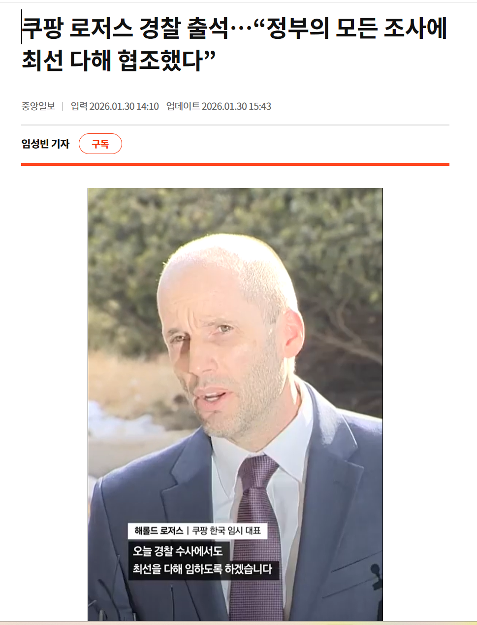 | Subject | 쿠팡 로저스 경찰 출석…“정부의 모든 조사에 최선 다해 협조했다” |