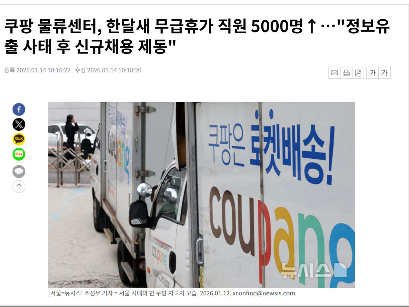 4520 경제쿠팡 물류센터, 한달새 무급휴가 직원 5000명↑…"정보유출 사태 후 신규채용 제동" 4 활활태워라 26/02/01 913 5