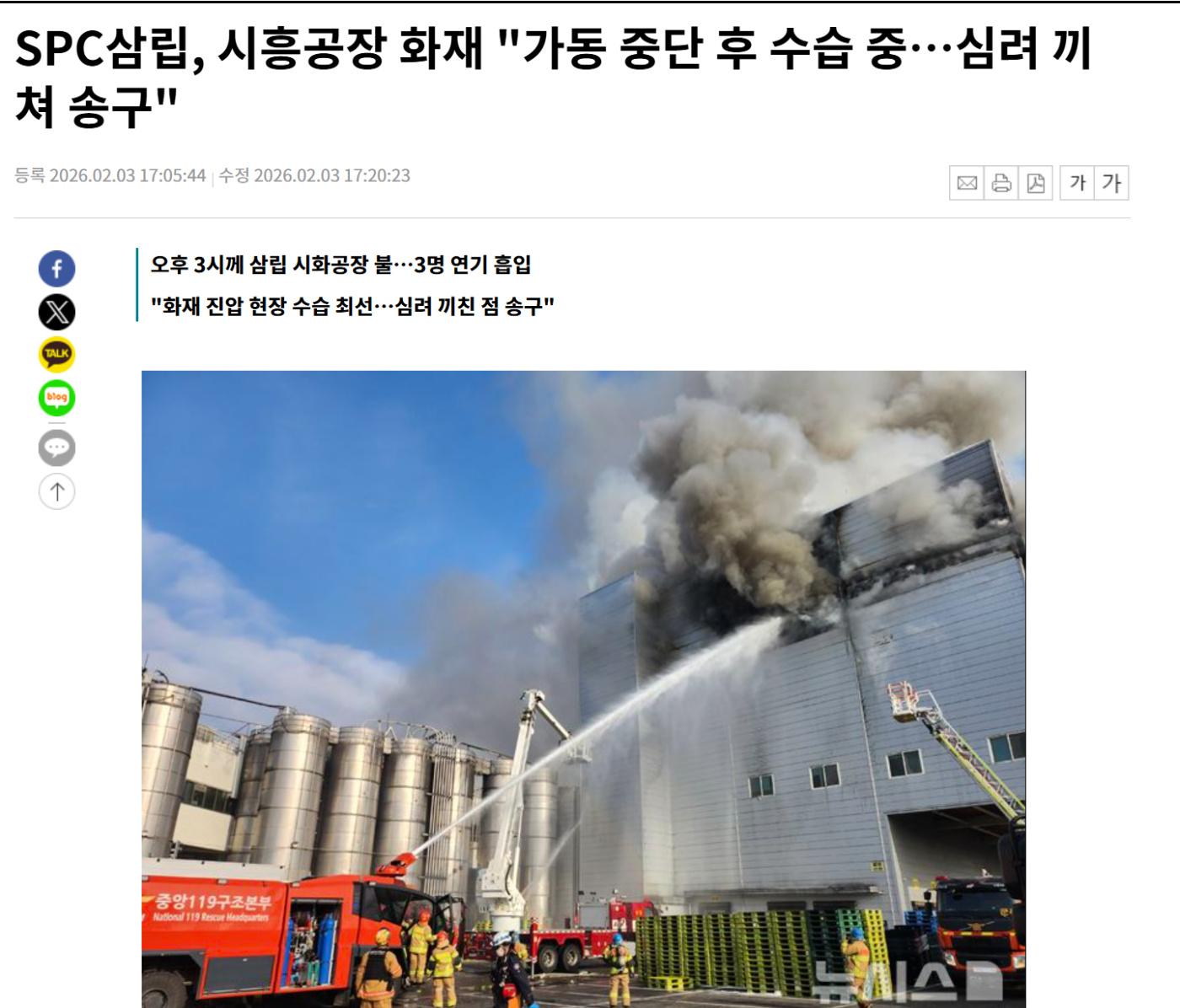 Subject   SPC삼립, 시흥공장 화재 "가동 중단 후 수습 중…심려 끼쳐 송구"