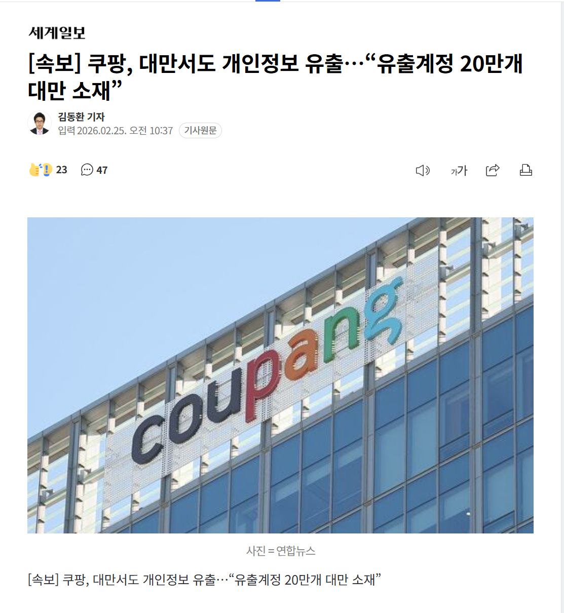 Subject   쿠팡 대만서도 개인정보 20만개 유출