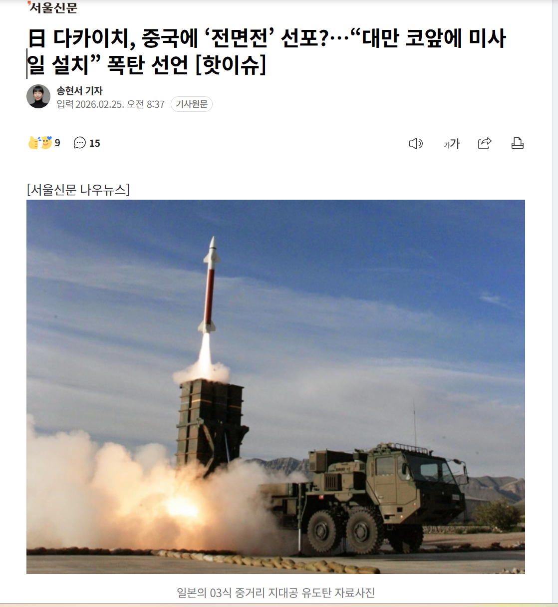 Subject   日 다카이치, 중국에 ‘전면전’ 선포?…“대만 코앞에 미사일 설치” 폭탄 선언
