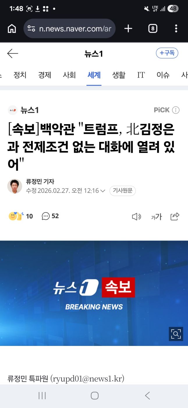 국제속보]백악관 "트럼프, 北김정은과 전제조건 없는 대화에 열려 있어" 3 + |