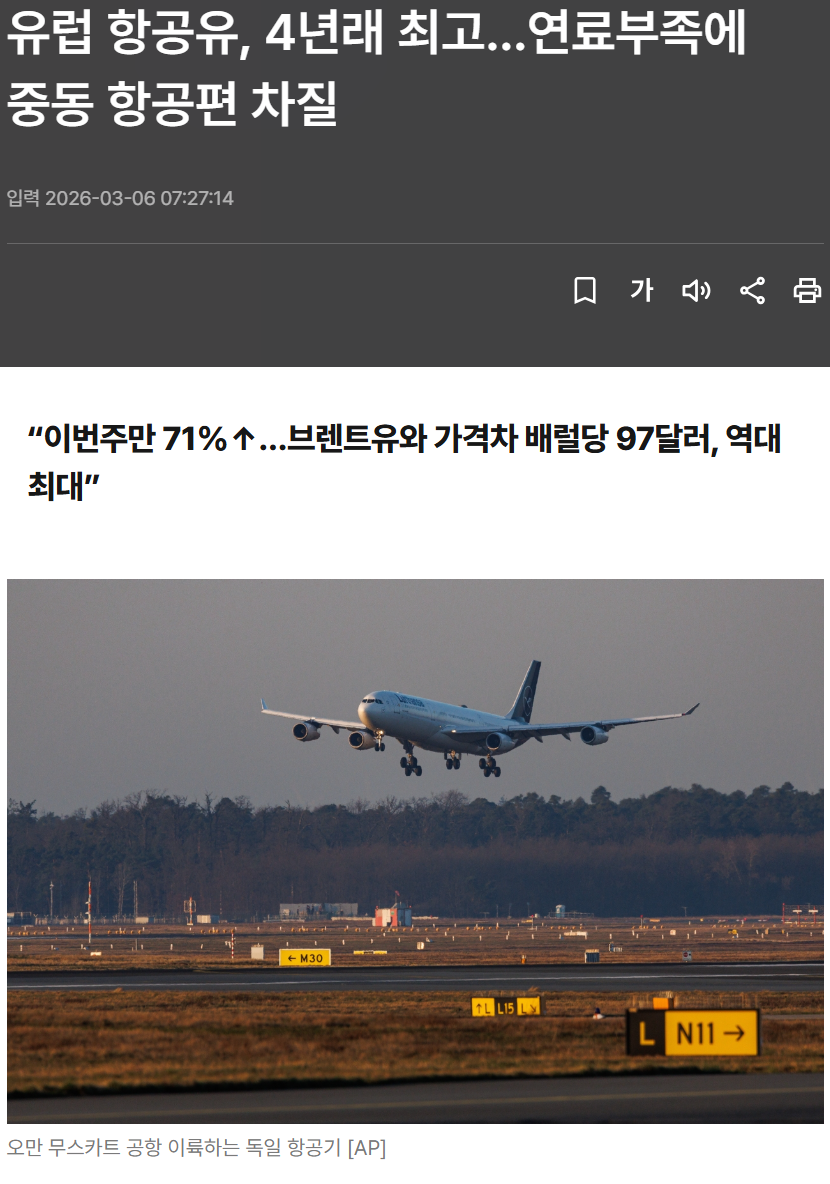 https://biz.heraldcorp.com/article/10688217 영국 원자재 정보업체 아거스(Argus)에 따르면 이날 북서유럽 항공유 가격은 전 거래일보다 12% 오른 t당 1416달러로, 2022년 6월 이후 최고 수준을 기록했다. 이번 주 상승률은 71%에 달했다. 유럽 항공유와 브렌트유의 가격 차이도 배럴당 97달러로 역대 최대 수준을 나타냈다. 아시아 시장에서도 항공유 가격 급등 현상이 나타났다. 브렌트유 대비 아시아 항공유 가격 차이는 전쟁 전 20~25달러 수준이었지만, 한때 200달러까지 치솟았다가 최근 80달러 선으로 내려왔다. 중동 건드린 대가가 너무 크고 무섭네요... 0