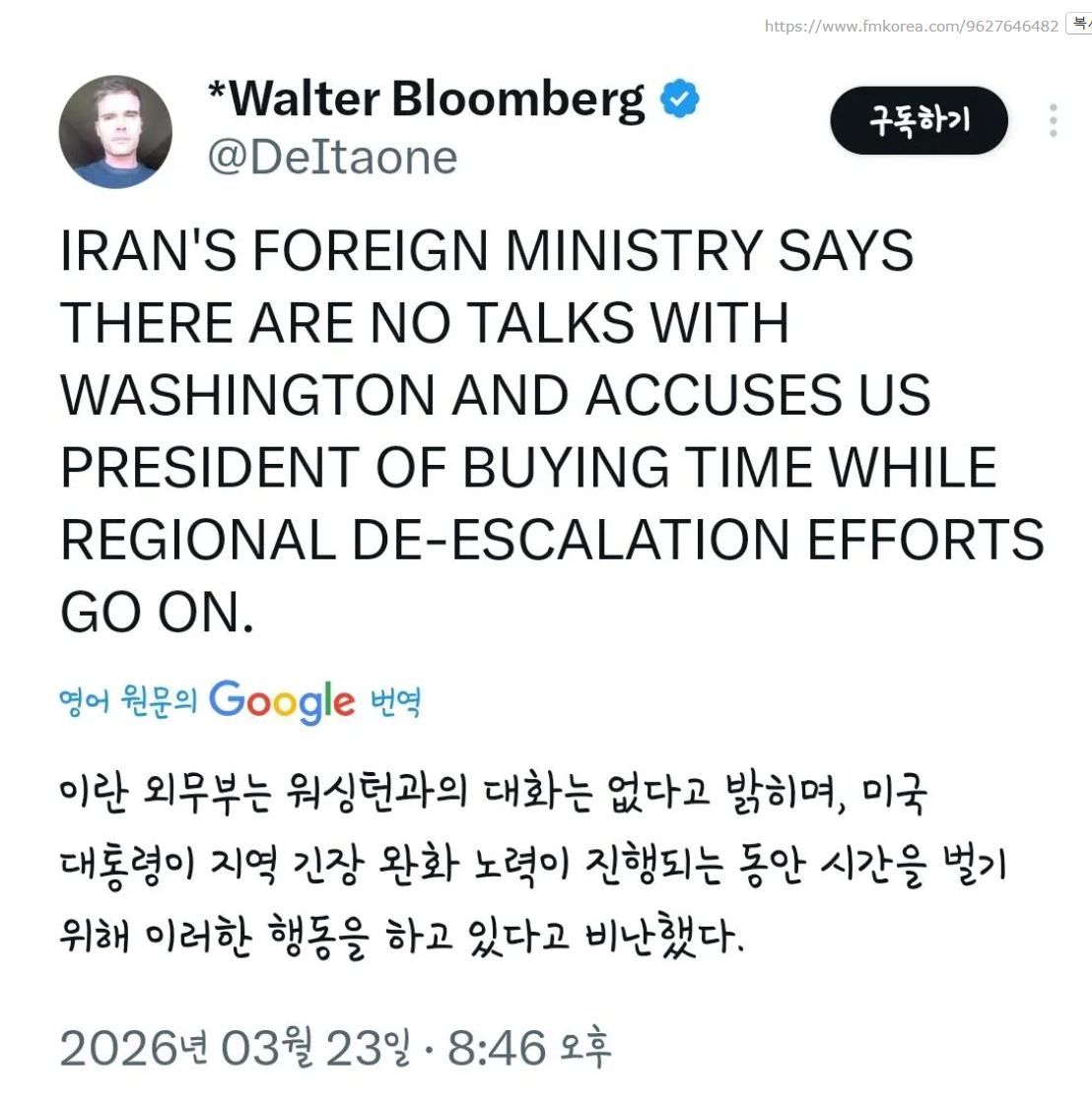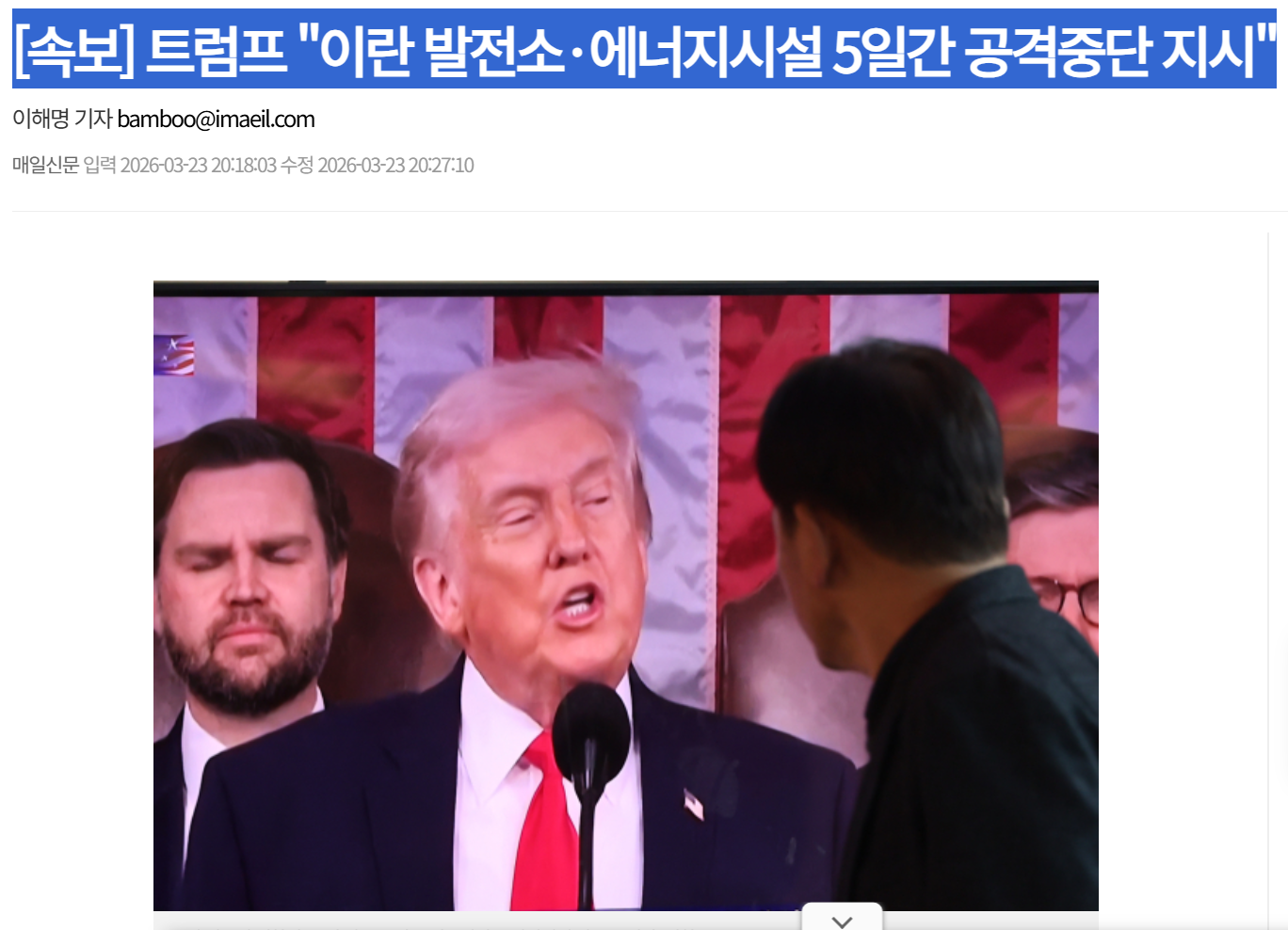 Subject   트럼프 "이란 발전소·에너지시설 5일간 공격중단 지시"->수정, 이란 그런적 없다.