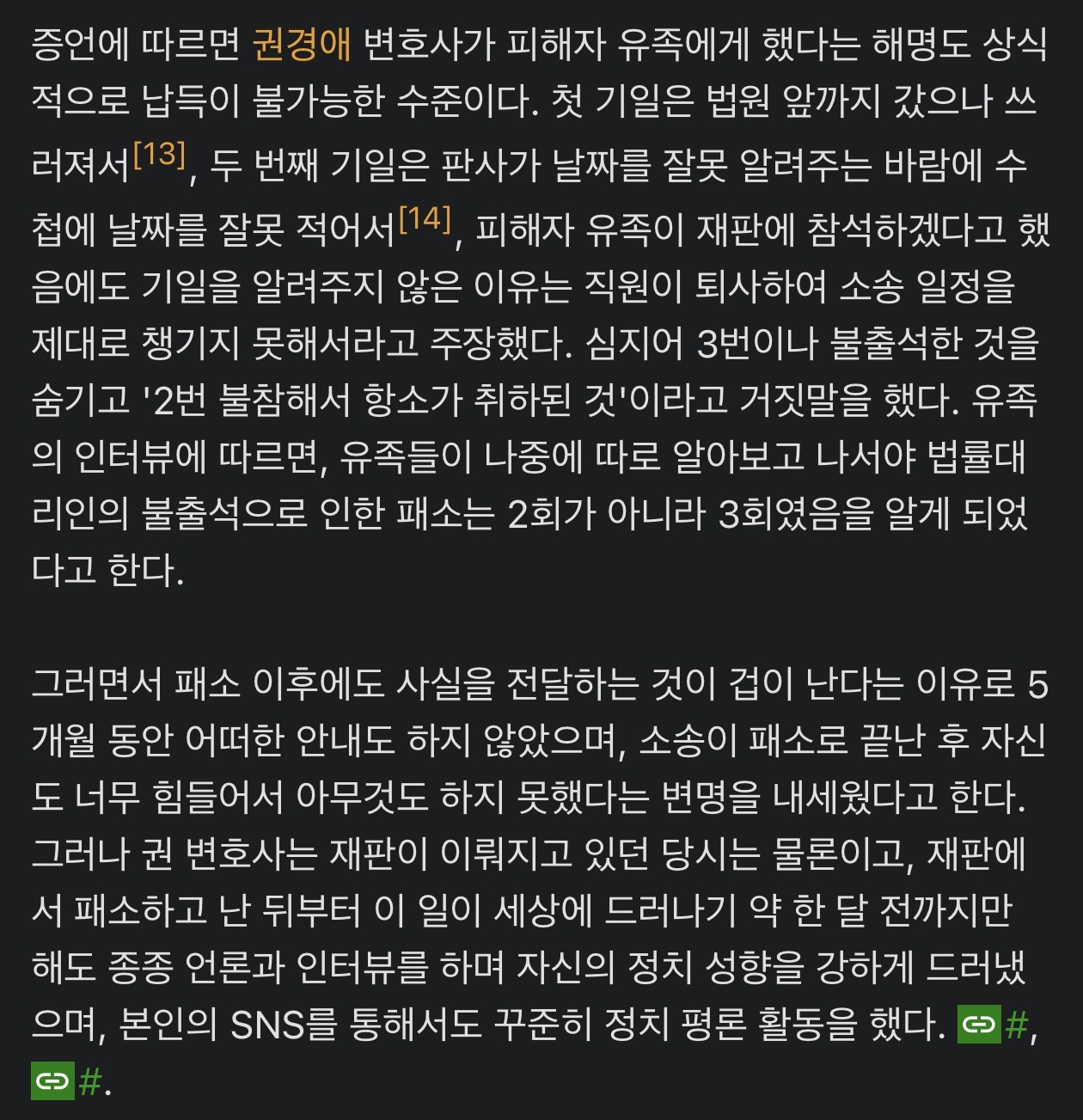 https://n.news.naver.com/article/023/0003966904?sid=102 서울고법 민사8-2부(재판장 오영상)는 고(故) 박주원양 유족의 “심리 일정을 잡아달라”는 신청을 받아들여, 오는 5월 20일 변론 기일을 열기로 한 것으로 25일 알려졌다. 이 사건은 학교 폭력에 시달리다 2015년 숨진 박양의 유족이 이듬해 가해자 등을 상대로 “5억원을 배상하라”며 낸 소송이다. 권경애 변호사는 유족 측 대리인을 맡았다. 유족은 2022년 1심에서 일부 승소했다. 그런데 같은 해 9~11월 권 변호사가 2심 재판에 세 차례 출석하지 않으면서 패소했다. 민사소송법은 당사자가 3회 이상 재판에 출석하지 않으면 소송을 취하한 것으로 간주한다. 권 변호사는 2심 판결 선고가 나고도 5개월간 유족에게 패소 사실을 알리지 않았고, 대법원 상고 기간을 놓쳐 패소 판결이 확정됐다. 다만 재판부가 5월에 변론 기일을 연다고 해서 곧바로 이 사건 재판이 재개되는 것은 아니다. 재판부는 일단 2022년 권 변호사 재판 불출석으로 인한 소송 취하 간주(패소)를 무효로 볼 수 있는지 등을 살펴볼 예정이다. ‘권경애 노쇼’로 패소 학폭 유족, 재판소원 밟기로 (2026.03.09.) https://n.news.naver.com/article/028/0002795097?sid=102 권경애 변호사의 항소심 재판 불출석으로 손해배상 소송 패소가 확정됐던 학교폭력 피해자 유족 쪽이 ‘재판받을 권리를 침해당했다’며 기일을 다시 열어달라고 법원에 요청한 것으로 9일 확인됐다. 유족 쪽은 담당재판부가 이 신청을 기각하고 ‘소송 종료’를 선언할 경우 이번 주 공포·시행 예정인 재판소원을 통해 끝까지 피해 회복에 나서겠다는 방침이다. 잘 해결됐으면 좋겠지만 가능한 건지 모르겠네요 0